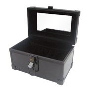 Square plastic corners in black, Key lock and handle, Black velvet lining and mirror.