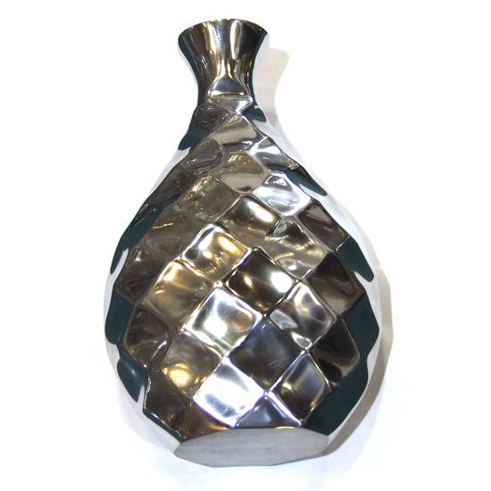 This is a flower vase made of aluminium. This handmade vase is shiny polished. It can stand firmly on any flat surface while holding several flowers.