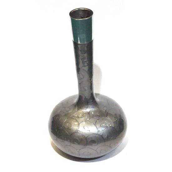 This is a flower vase made of aluminium. This handmade vase is shiny polished with enamel finish. It can stand firmly on any flat surface while holding several flowers.