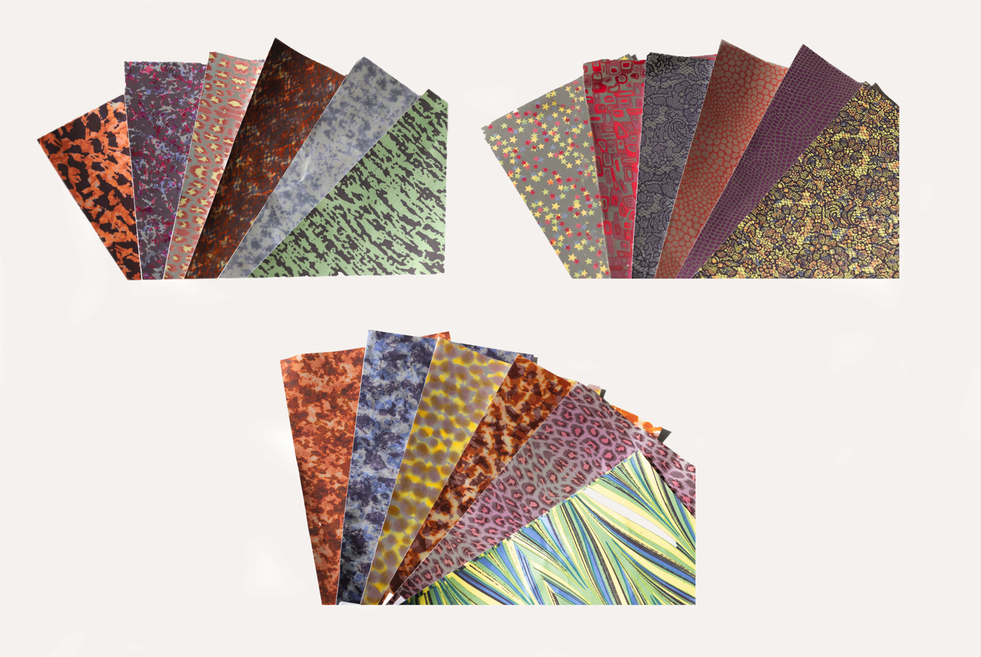 A variety of decoration heat transfer aluminium foils. Patterns can be transferred onto metal, plastics and heat resistant materials by heat. Transfer foils can be used in variety of products including jewelries, watches, spectacles and accessories, etc.