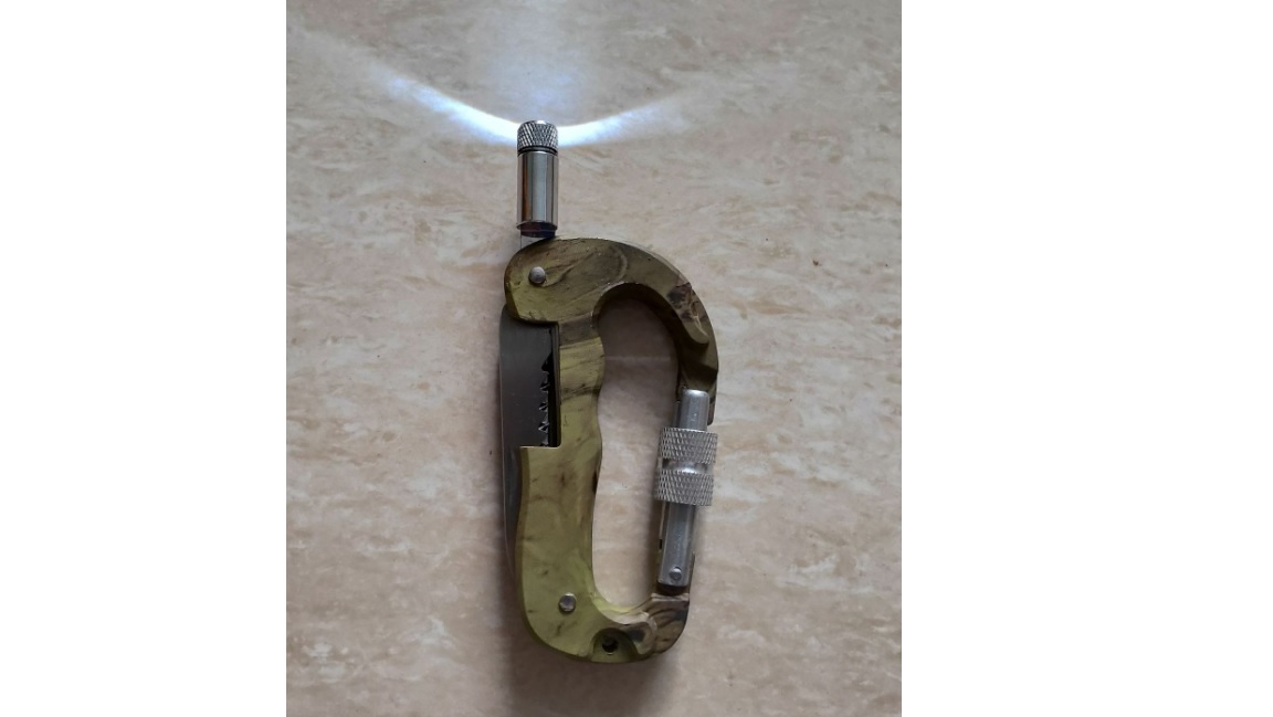 This key carabiner also works as a clip, saw blade, bottle opener, file, and light