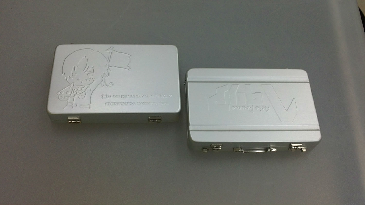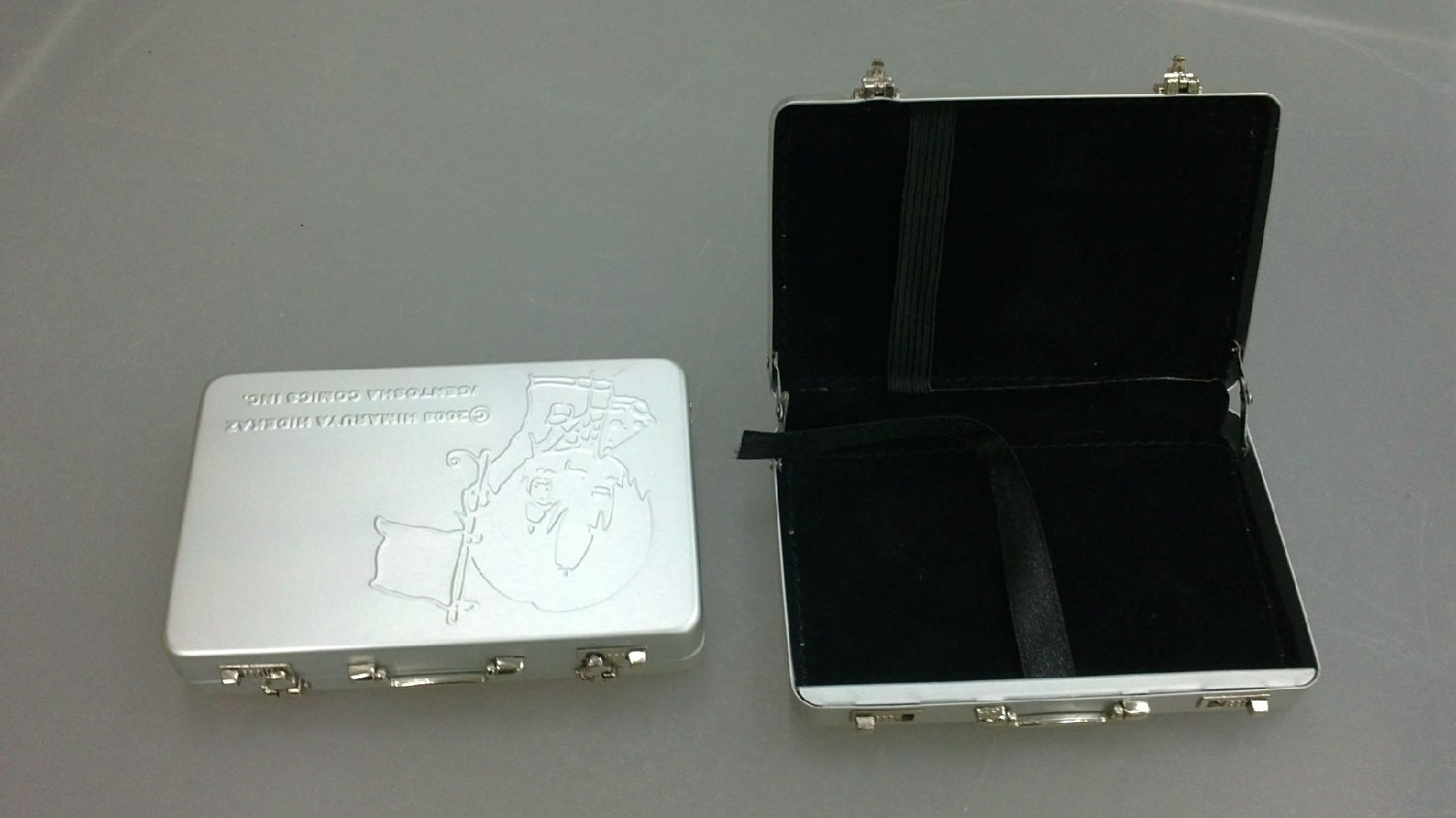 Integral aluminum card and coin holders with embossing, particular for those collectors who like Japanese carton and comic. Mini briefcase style with lock system and handle