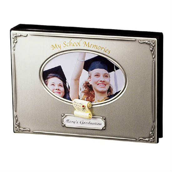 This photo album features an aluminum cover and an oval front panel. The front cover is accented with delicate adornments and printings, while the front panel allows a quick peek inside. This aluminum cover photo album serves as a nice archival for your favorite graduation moments.