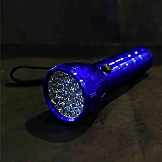 This is an LED flashlight with a sleek, blue-colored finish. It boasts an aluminum construction for long-lasting durability. This flashlight makes a great item for camping, traveling, etc.