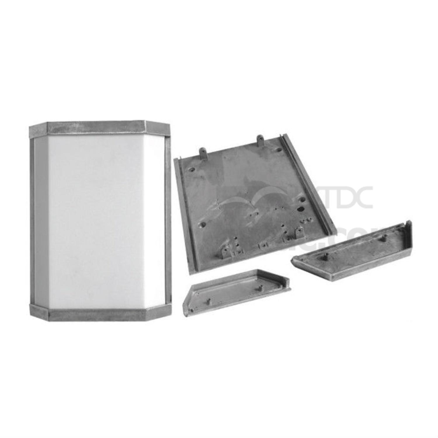 Featured is a die-cast housing for LED wall light. This aluminum light housing includes a trapezoidal shade, a wall-mounted base as well as the top and bottom, which constructs a sealed, water-resistant protection for the inner LED module. The milky cover diffuses soft and non-glare glow to help create a cozy ambiance.