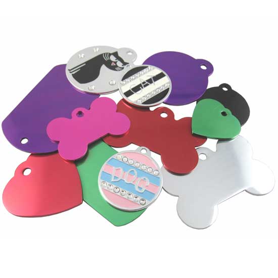Displayed here is a collection of pet tags in different colors and shapes. The aluminum construction ensures high durability. These aluminum pet tags are built to last for years.
