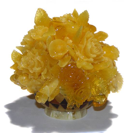 This is a decoration made of transparent and opaque amber. It has carving of large 3-dimensional flowers and leaves to mimic a flower basket.