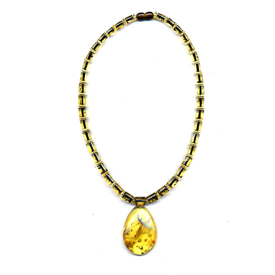 Pictured here is an amber necklace designed for ladies. The oversized amber pendant showcases a sophisticated touch. This amber necklace complements your look in a dainty way.