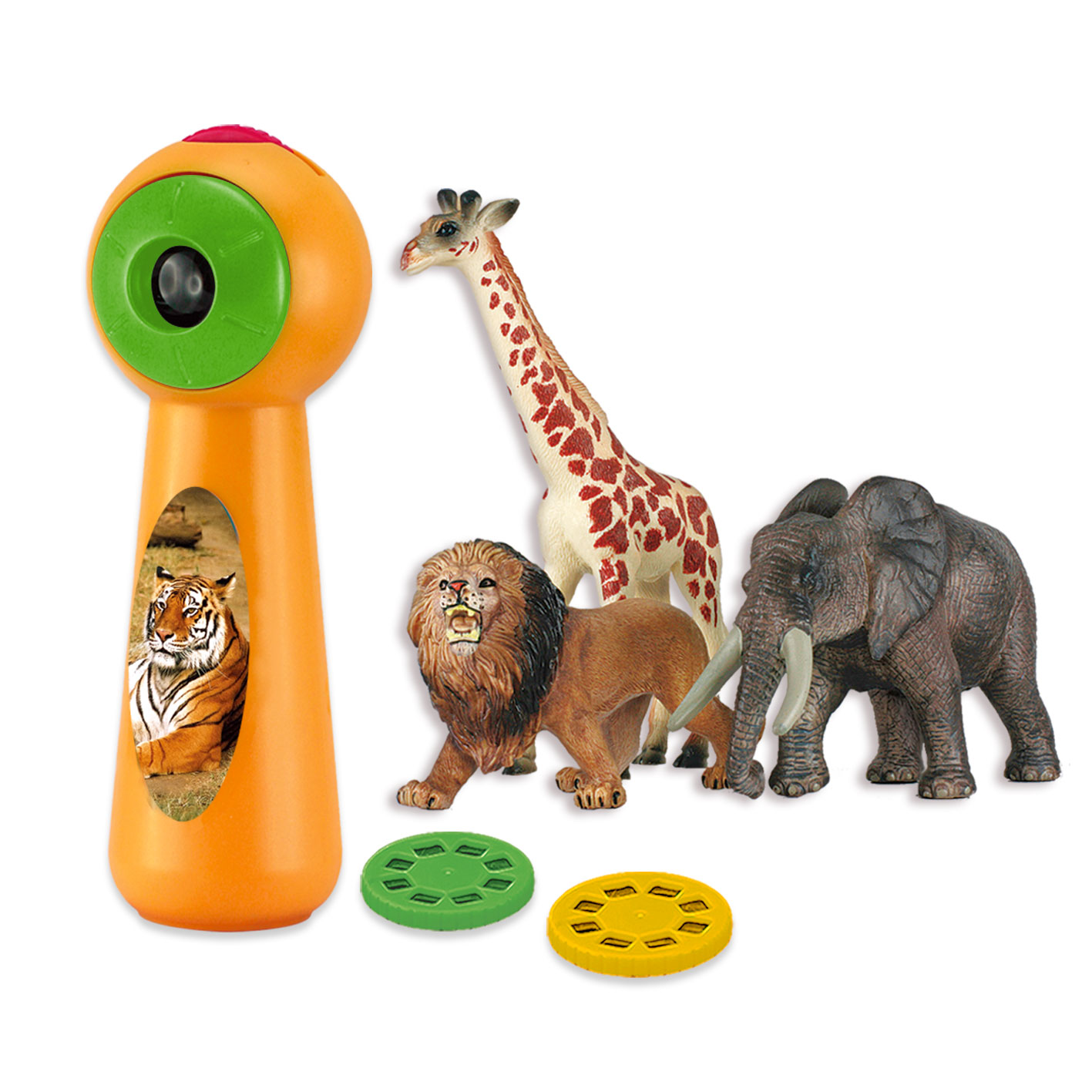 Projects 24 colored animal images from 3 discs;