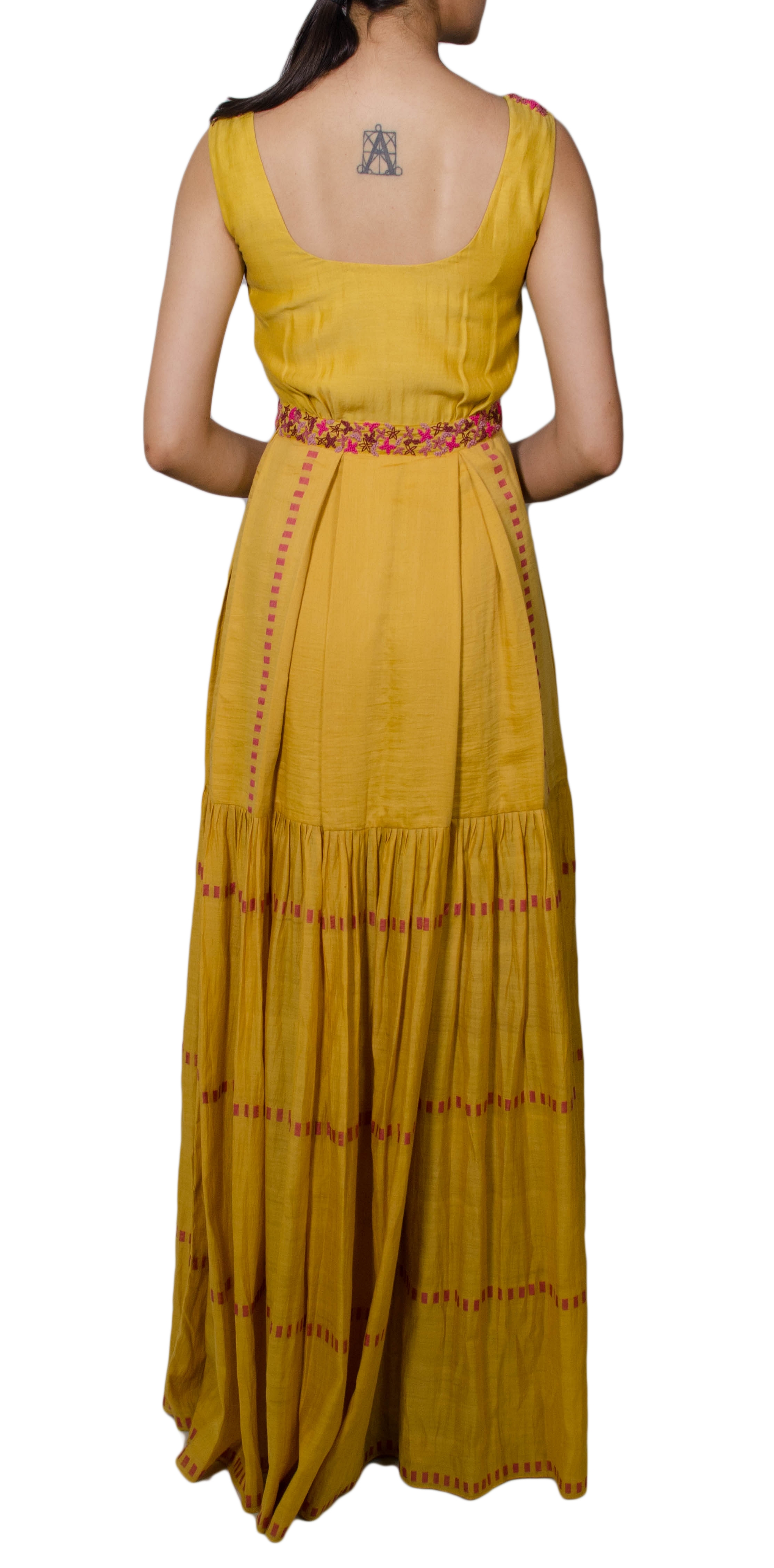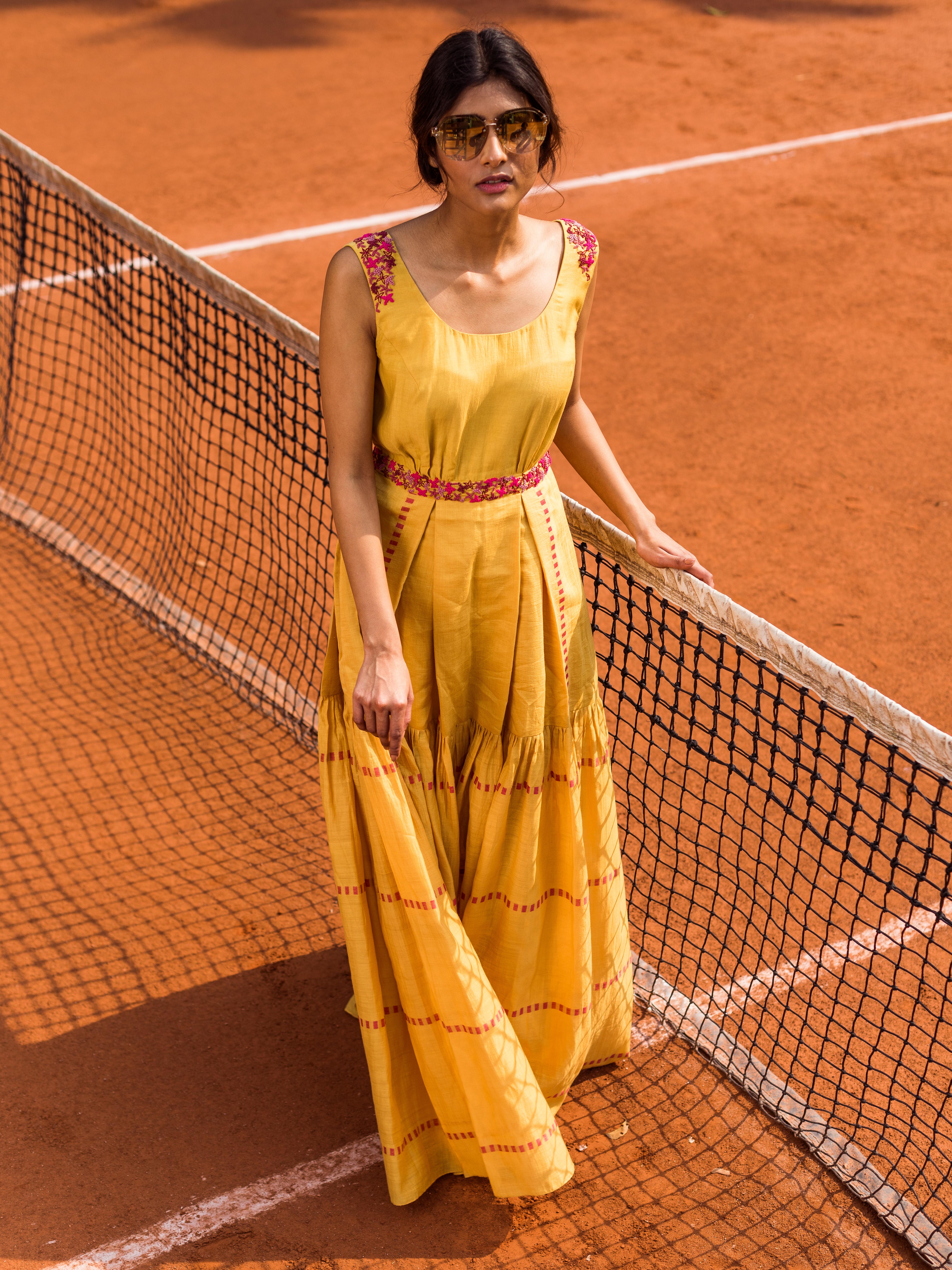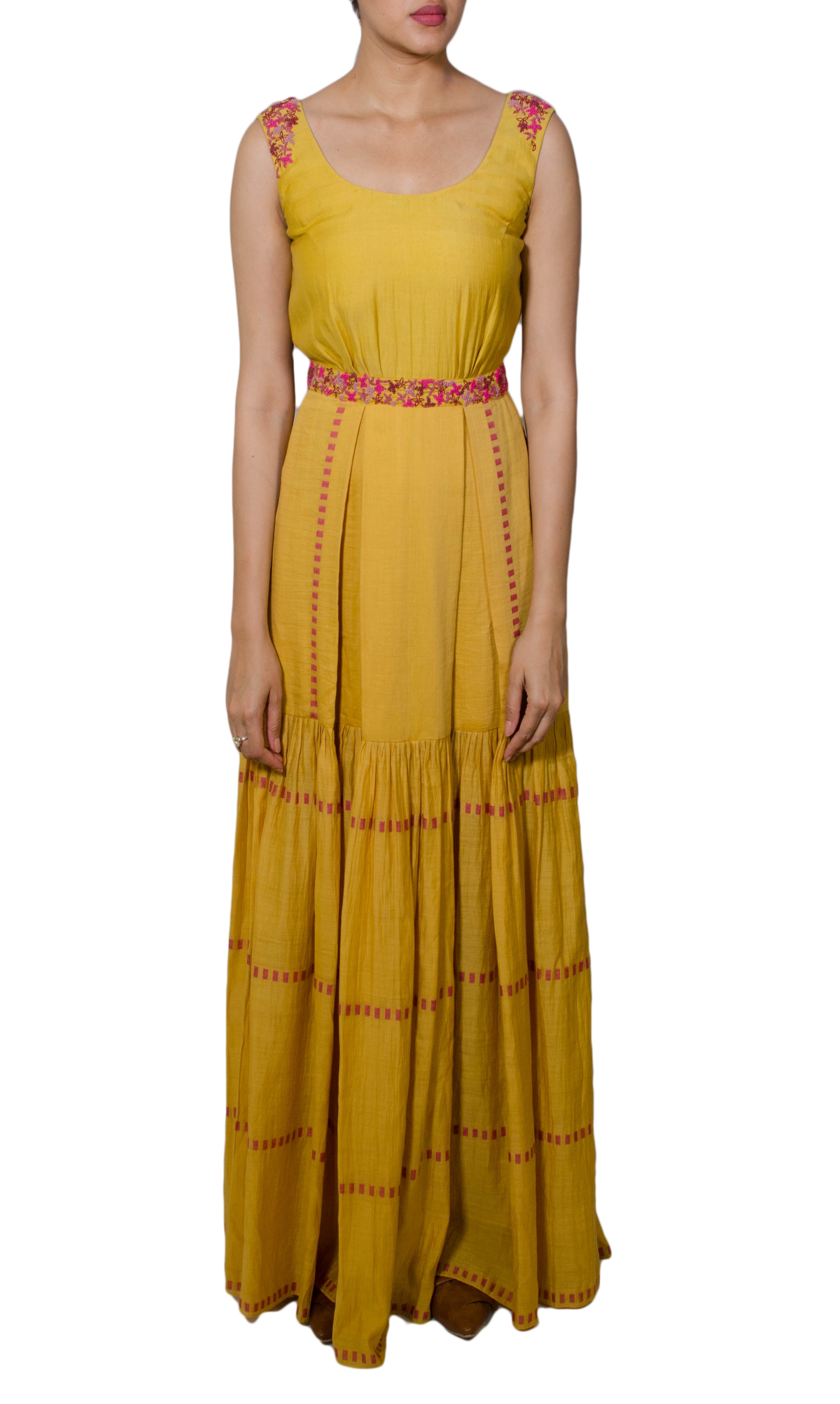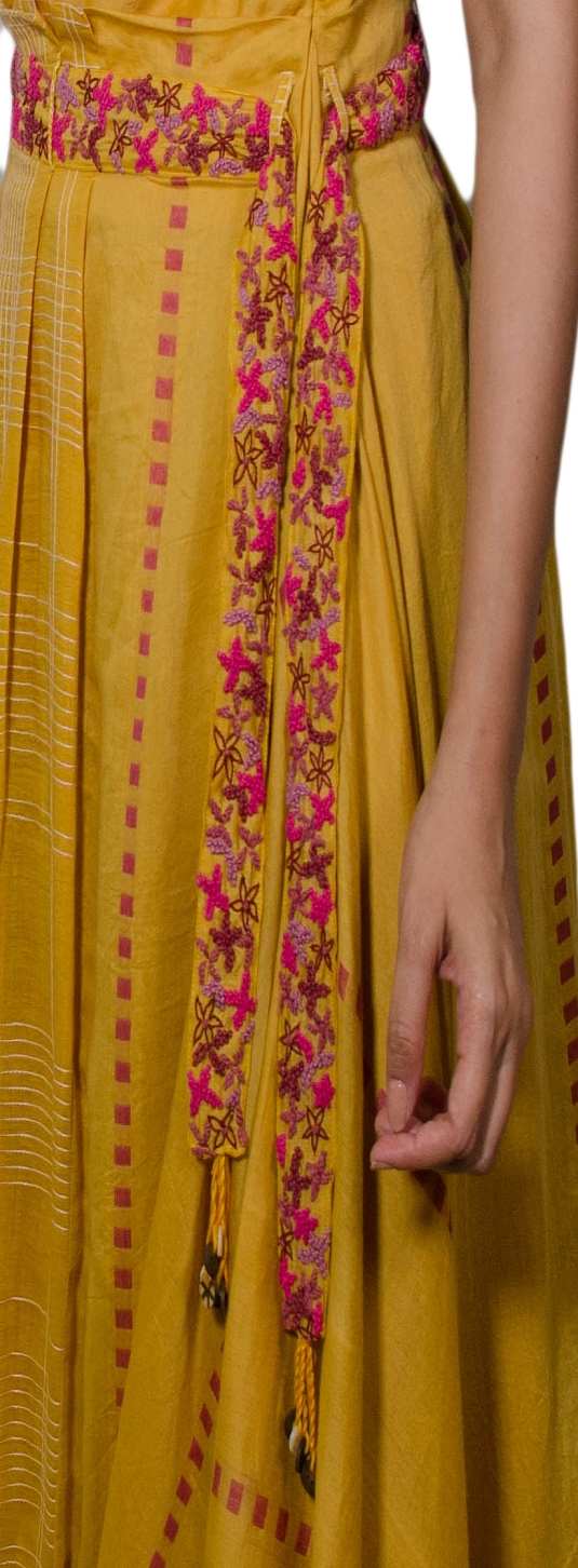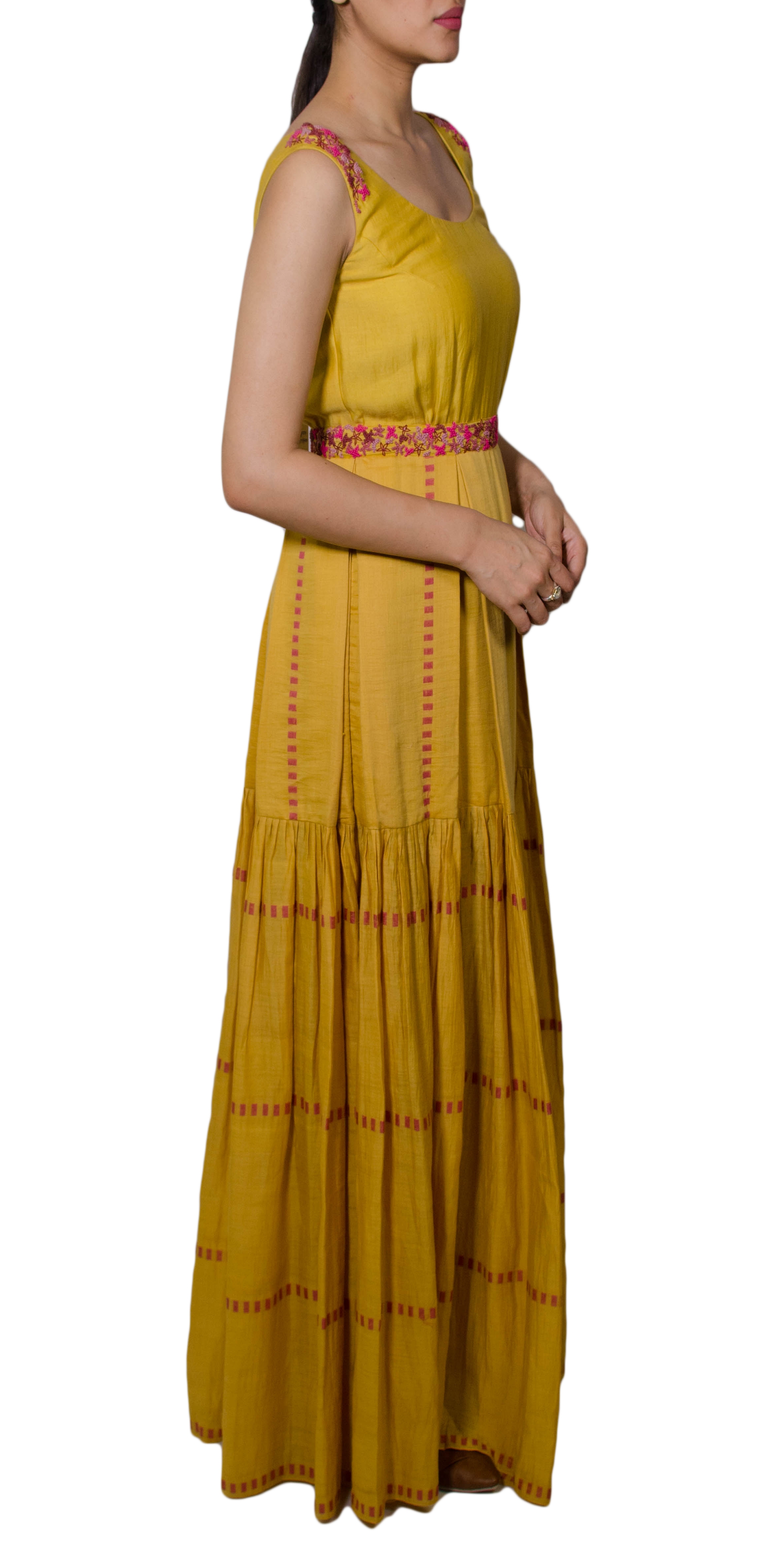 Mustard Yellow Embroidered Tier Dress With Pink Weave Detail