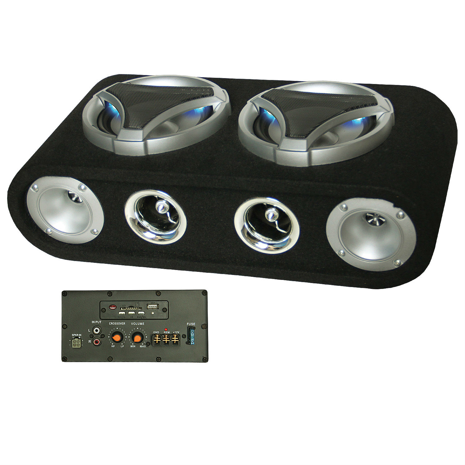 6.5" woofer with LED light, amplifier, USB and SD jack.