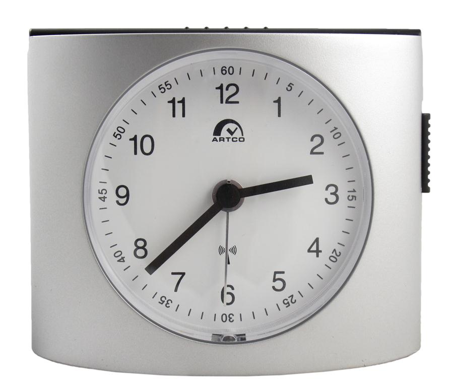 - This radio-controlled clock features a plastic case with a round white dial of Arabic numeral display.