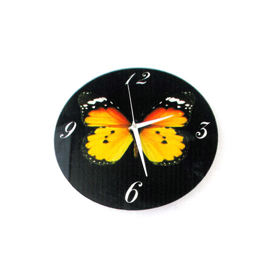 This is an analog clock with a charming and elegant design. It features a black dial which is printed with a vivid and lifelike butterfly pattern. This well-made clock is a perfect addition to any trendy home décor.