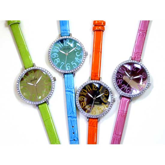 This analog watch exhibits a vibrant design. The slim bezel boasts delicate decorative round stones which offer splendid refraction of light. The glossy straps feature unique crocodile-skin patterns, showcasing an elegant style. This watch makes a special gift.