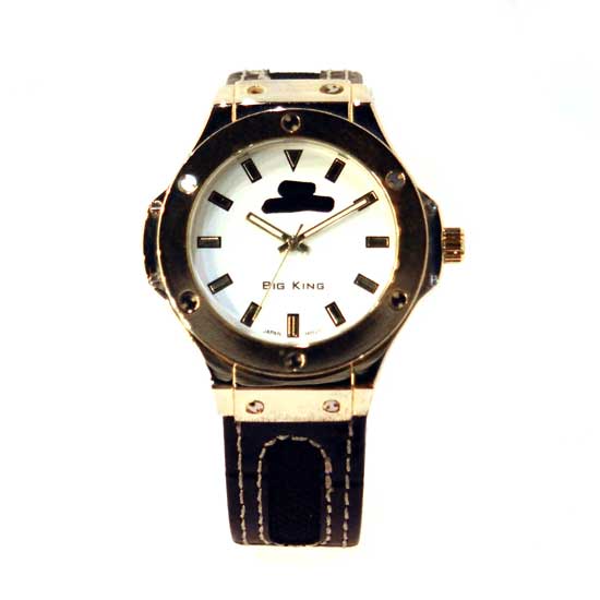 Displayed is a men's analog watch that comes with a golden alloy case for a stylish look. The bezel is embellished with sparkling stones, which forms a harmony with the shiny stroke hour markers. This high quality analog watch comes with a leather strap for your comfort.