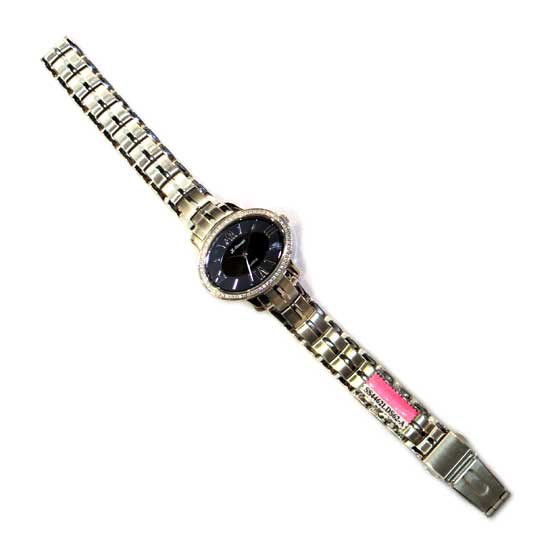 Displayed is a women's analog watch that comes with a black oval shaped dial enclosed in a sparkling stone-embellished bezel for a charming look. The quarter hour markers are designed in Roman numerals with a metallic luster for a fashionable touch. The strap is made of stainless steel for a shiny finish and durability.