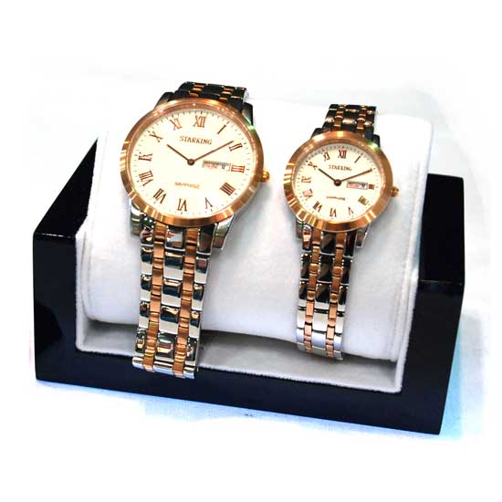 Featured is a set of analog watches that includes one for men and one for women. The dials with Roman-numeral hour markers create a retro and artistic image. This analog watch set is a good gift idea for couples and lovers.