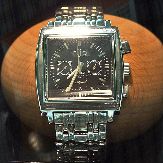 As shown is a grand watch with a rectangular case. The whole watch is of high gloss finishing. It matches well with formal apparel.