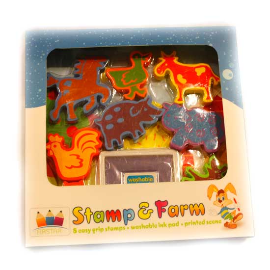 This fancy animal stamp set features stamps of farm animals such as rooster, pig and duck. Coming along with the set is a washable ink pad and printed scenes. Players can complete the farm scenes and create their own craft with the stamps.
