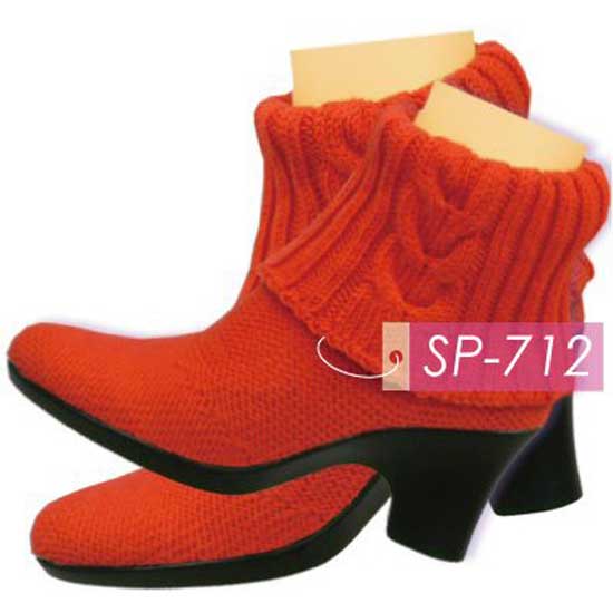 Highlighted is a pair of ladies' ankle boots with middle heels. The boots feature knitted uppers to exude a warm winter style. The knitted patterns on the sleeves make the design even more exclusive.
