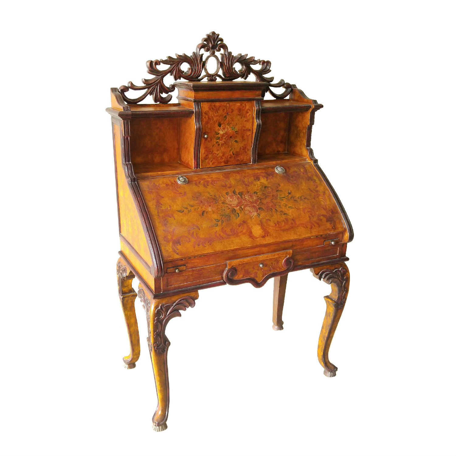 This secretary desk boasts an antique design to complement any workspace decor. It features a drop down cabinet to create a flat writing surface and as well as ample space for supplies. This antique secretary desk makes an elegant piece of furniture while conserving space.