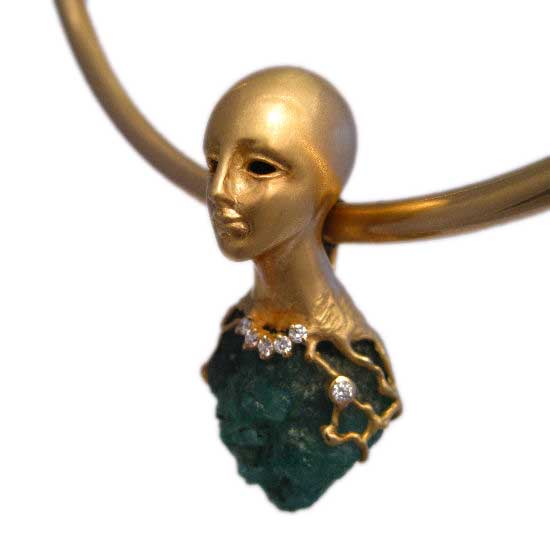This glamorous pendant comes with an Aphrodite motif that represents goddess of love and beauty. Finely crafted of 18K gold, this elegant pendant is adorned with a large blue emerald stone accented with dazzling small white diamonds. Meticulously designed, this beautiful pendant is an ideal addition to complete your wardrobe.
