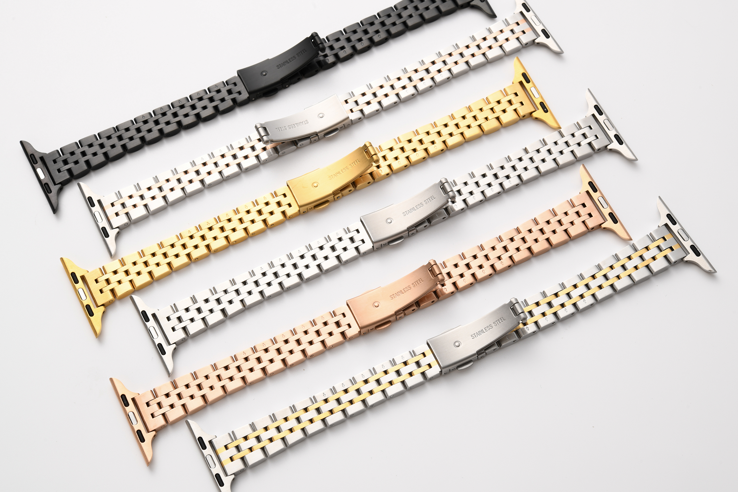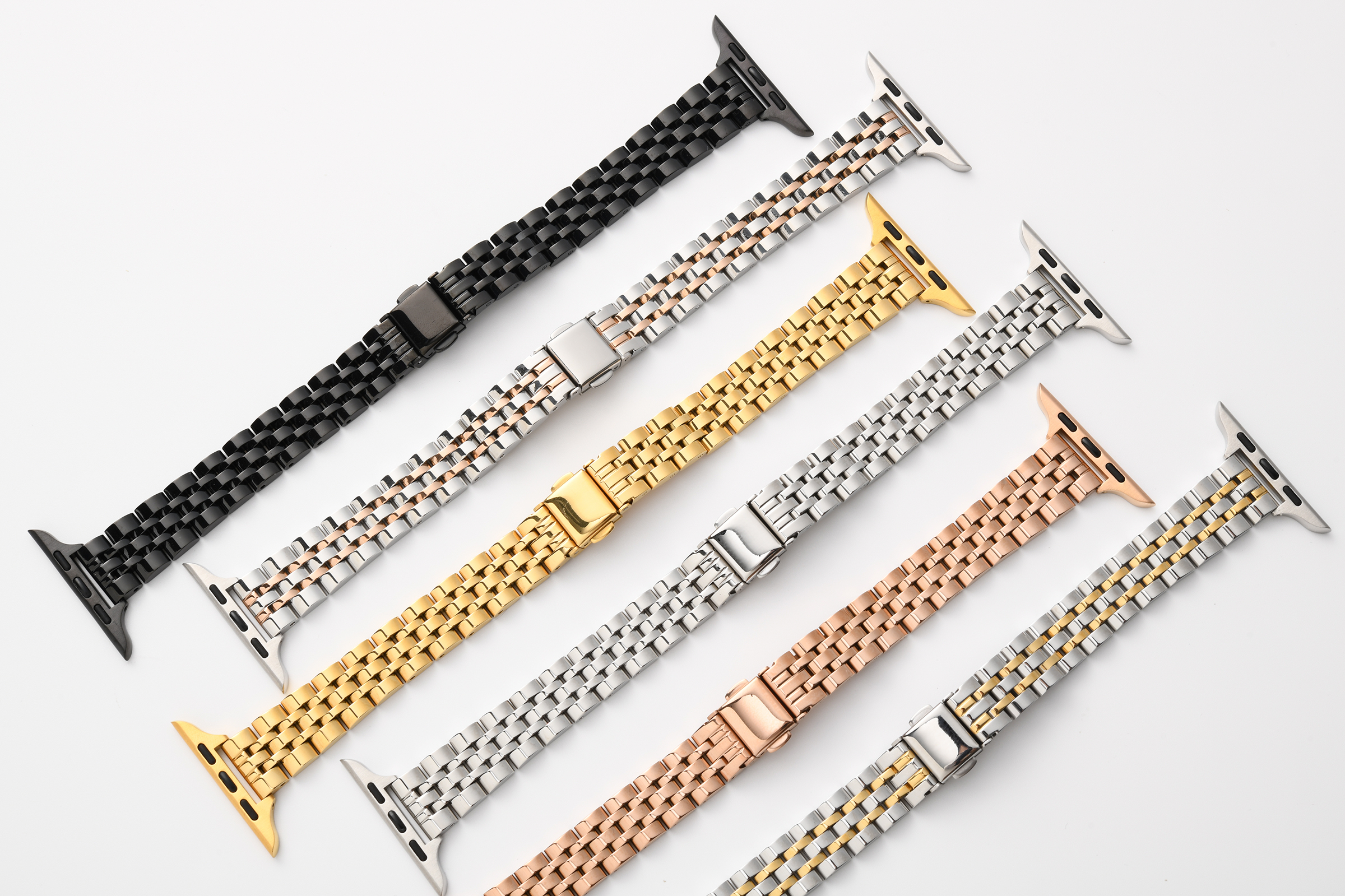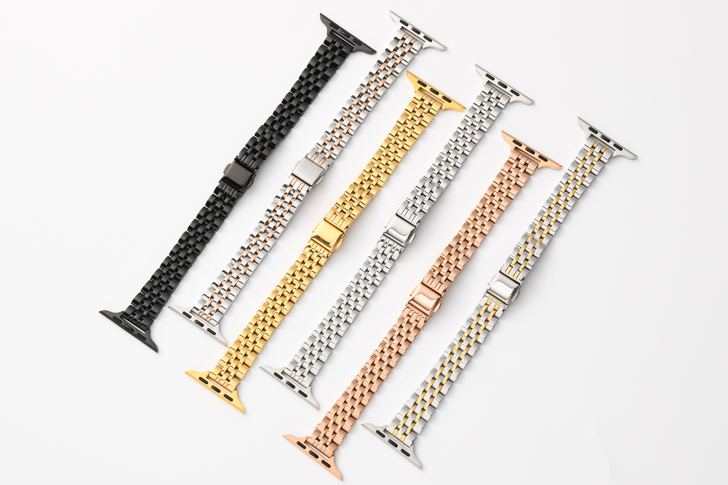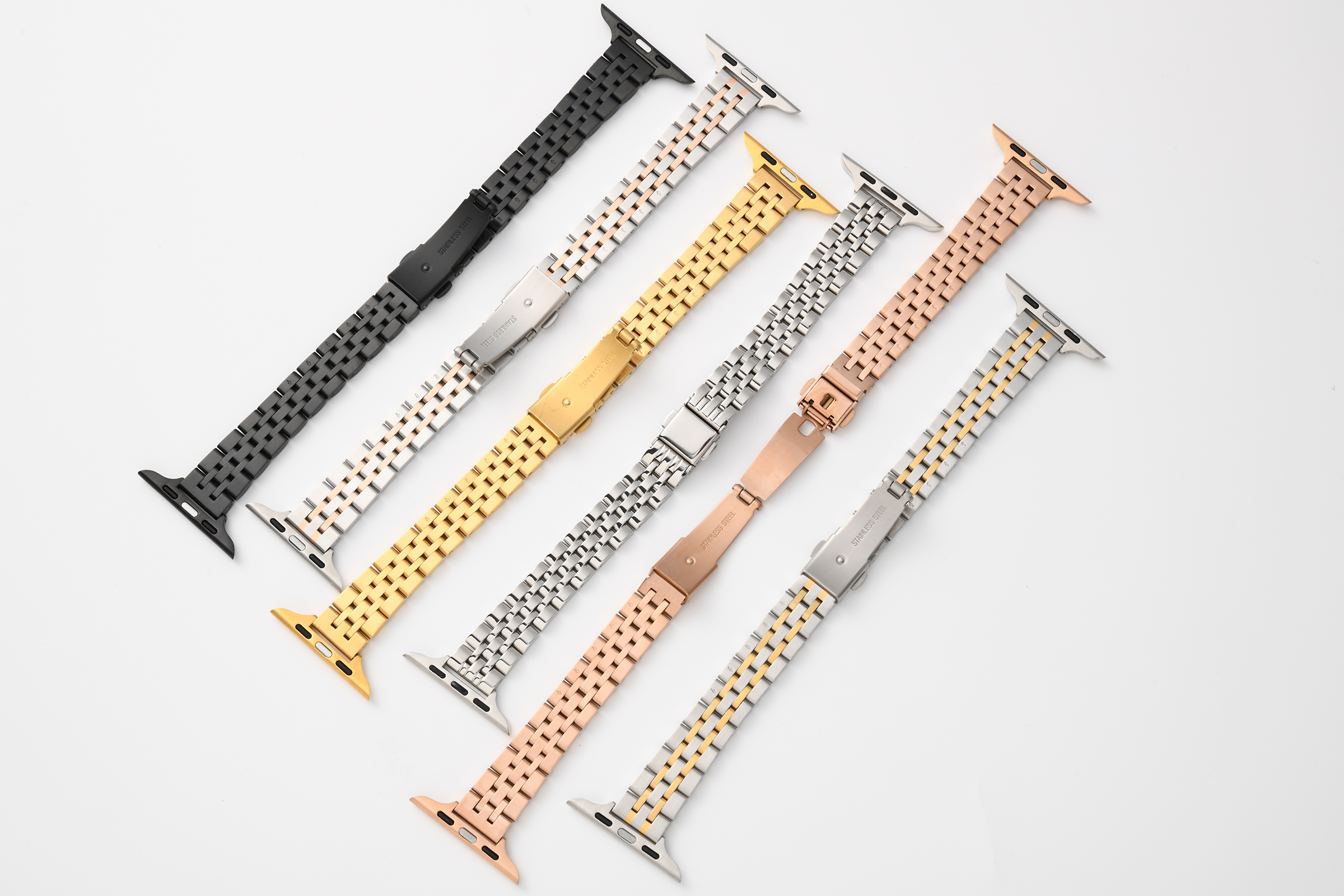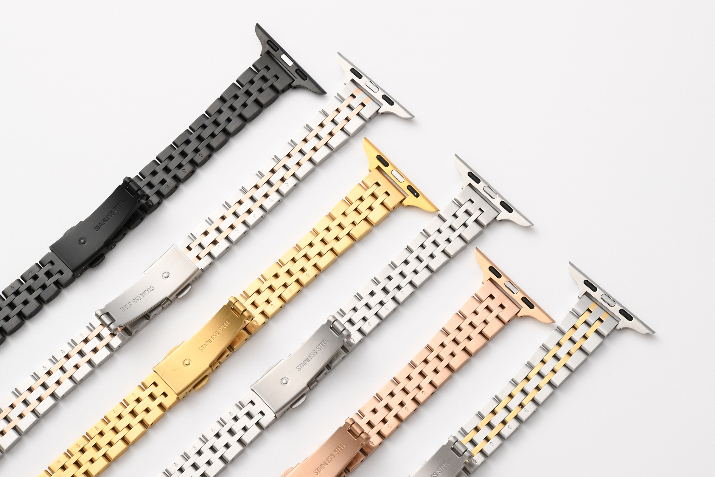 Slim stainless steel five-link bracelet with a tapered (narrowing) profile for a cleaner, more elegant fit on the wrist.
