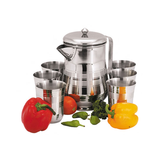 This is a 7pc aqua jug set with a high-gloss finish. It is made of quality stainless steel for a long service life. This stainless steel aqua jug set is suitable for household use.