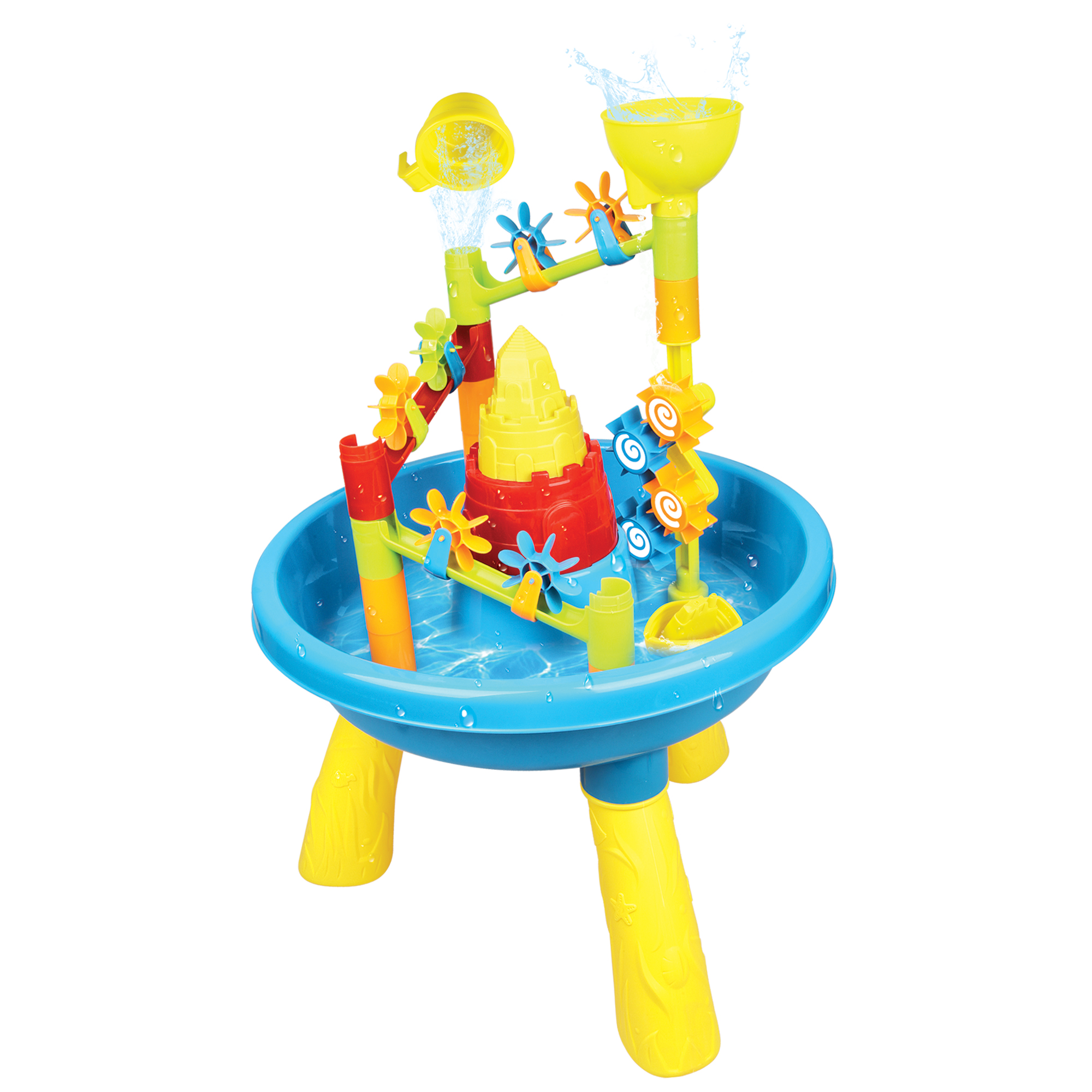 Water drives the colorful wheel to rotate.