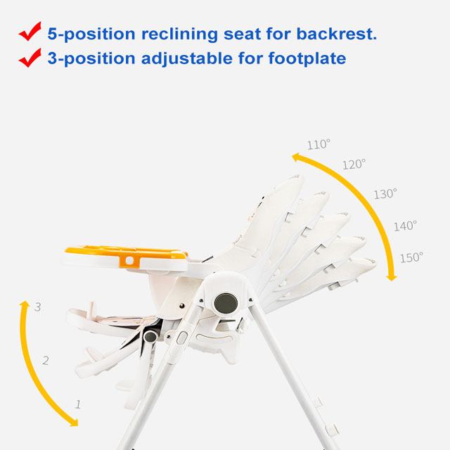 *6-position for height. *5-point harness. *5-position reclining seat for backrest. *3-position for double tray. *3-position adjustable for footplate. *Stoppers or wheels. *Footrest and backrest change the inclination separately,when backrest change the inclination, seat base will be moved into front. *Big basket can be chosen. *PVC or PU seat cover.