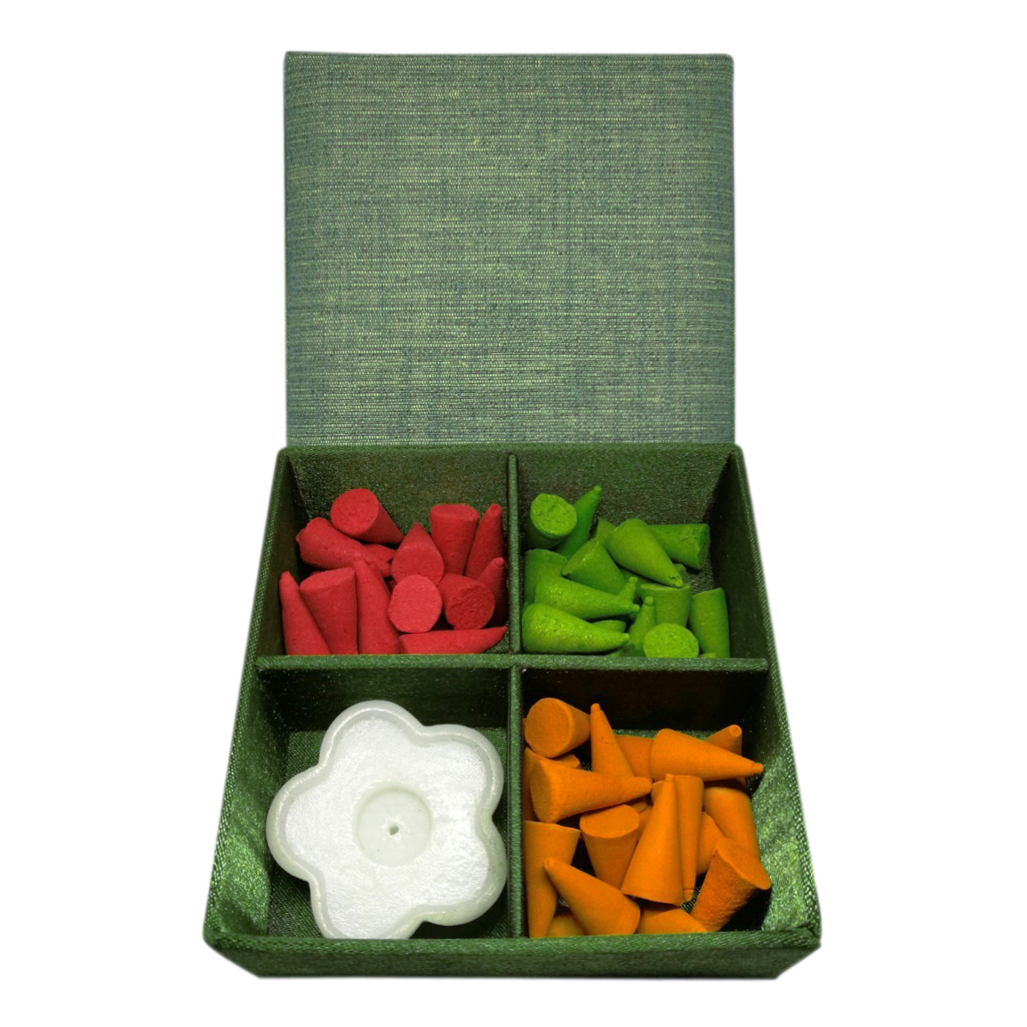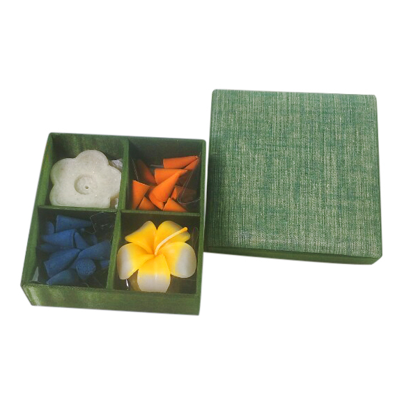 Aroma Incense Cone with the incense holder and flower candle. Put inside the silk box.