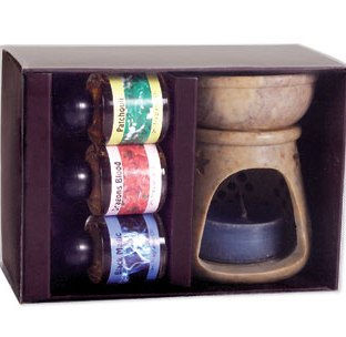 • Contains ceramic or soapstone burner with aroma oil bottles and a T-lite candle.