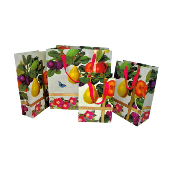 This art paper bag comes in assorted shapes for your selection. It is delicately printed with fruit in vibrant colors. The ribbon handles make it perfect for long lasting use.