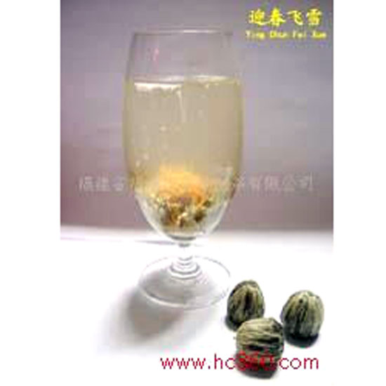 Showcased are ball-shape tea leaves made from fragrant herbs. Put this tea leaf ball into water and it will spread slowly into a graceful flower. This art tea leaf lets you enjoy the tea visually.