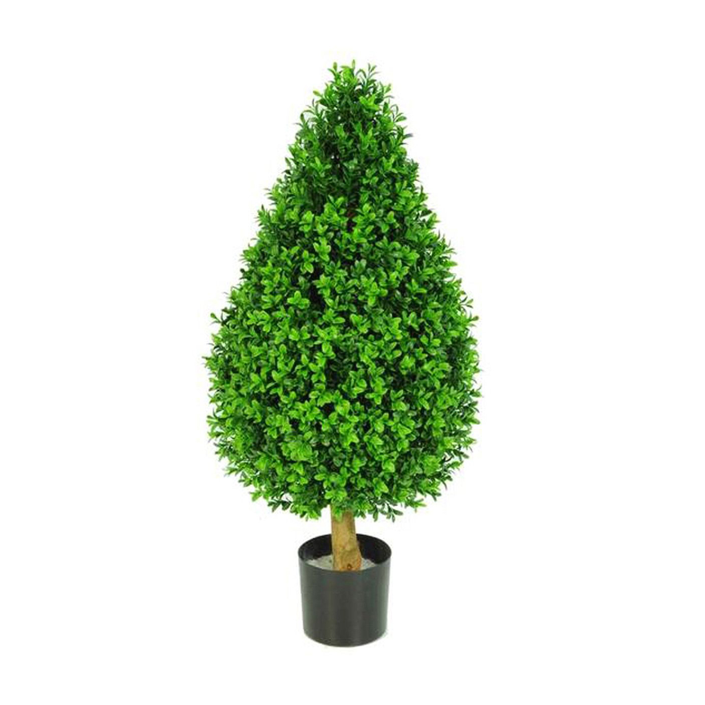 This artificial baxus tower tree is made of plastic. It creates a green accent to beautify the space. It is a good decoration for your home or workplace.