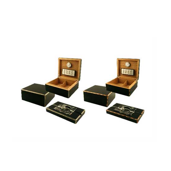 This ashtray humidor is designed for 40 cigars. With marquetry trimming on a piano finish, this humidor is elegant and beautiful. The inner is made of Spanish cedar and is polished with cedar veneer. This humidor comes together with one humidifier and one analysis hygrometer.