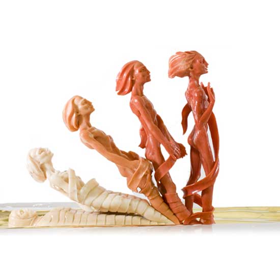 The displayed sculpture comes with five glossy vivid figurines with straps covering their bodies. This artistic sculpture is made out of Asiatic coral for a luxurious touch. This distinctive coral sculpture in three colors is entirely realized in Italy by master engravers.