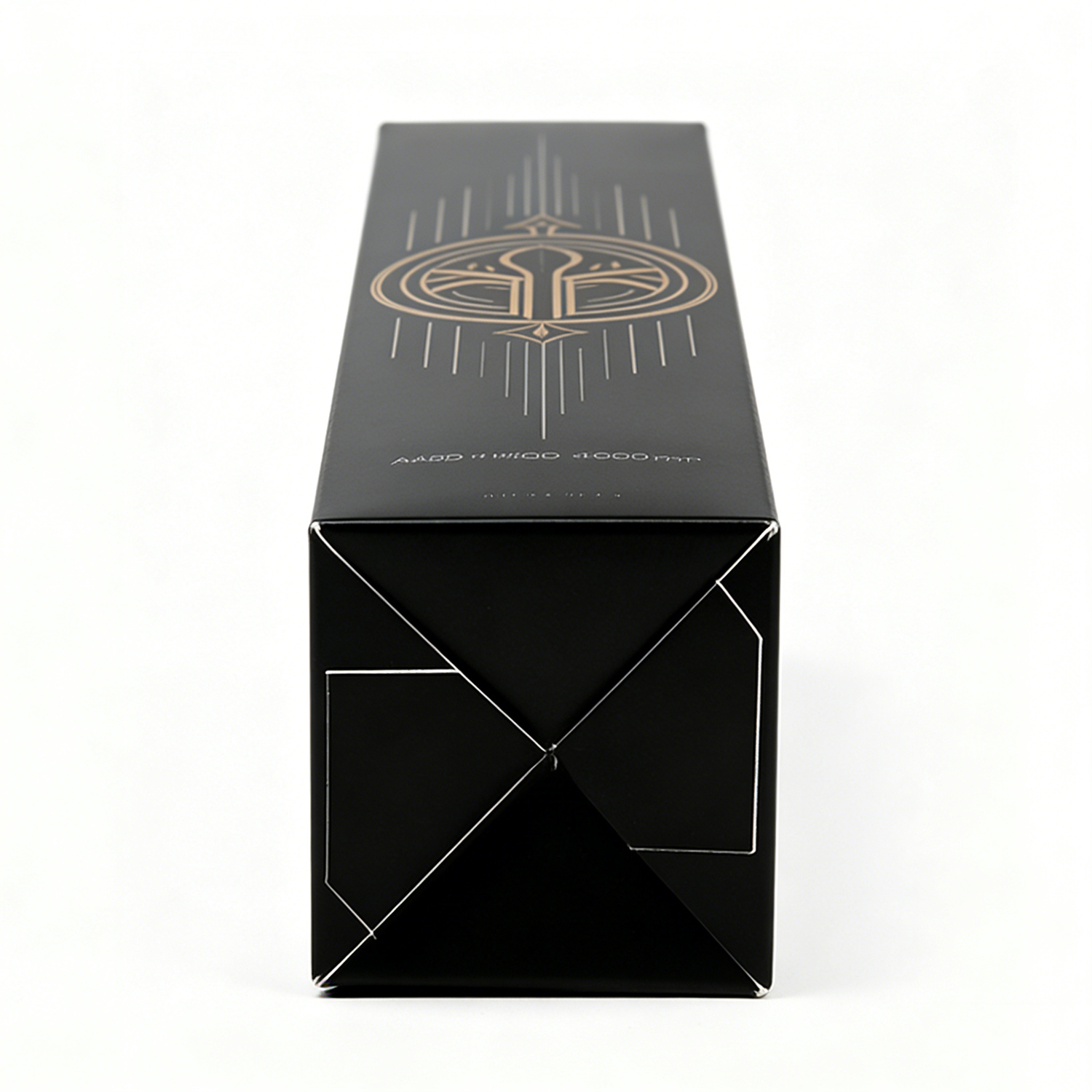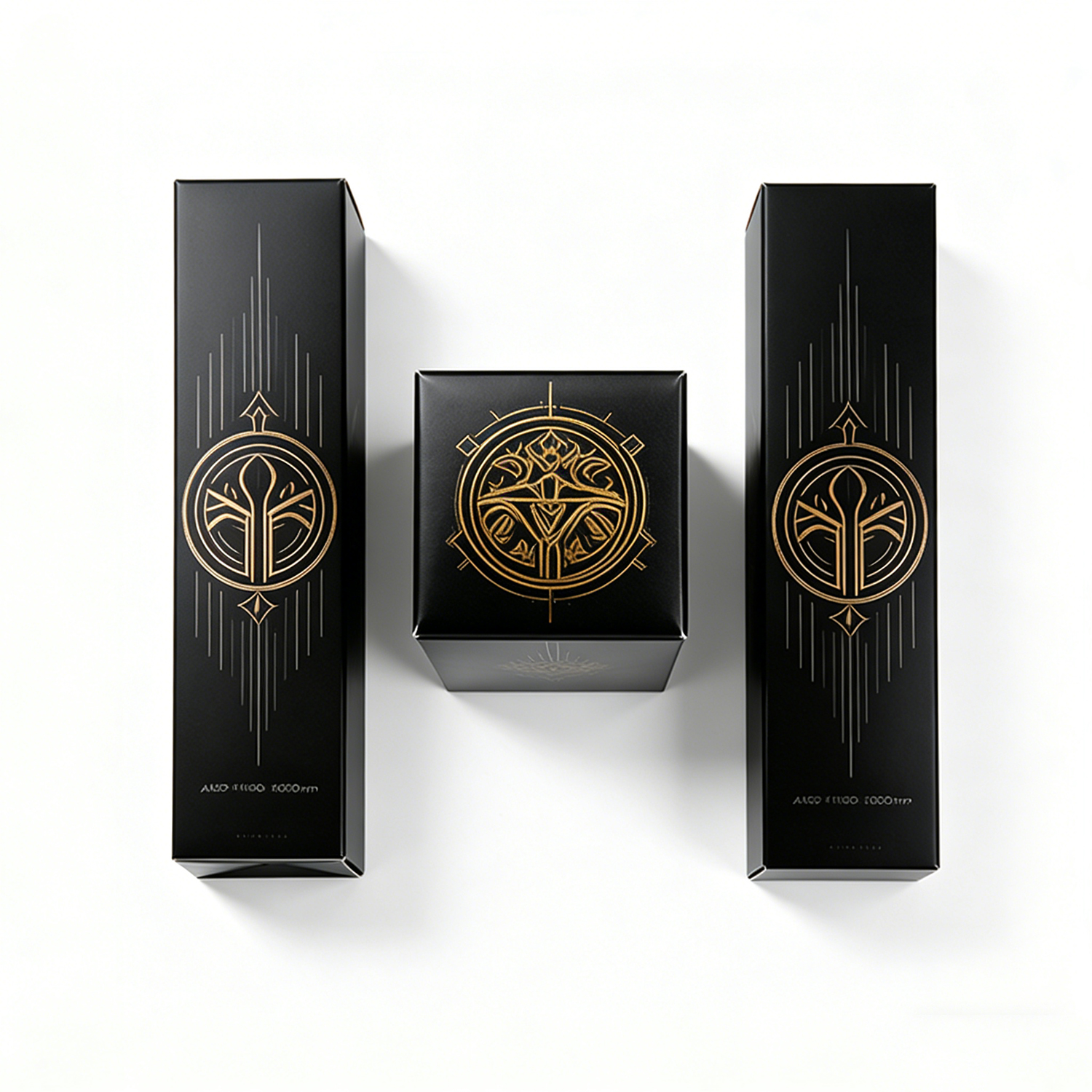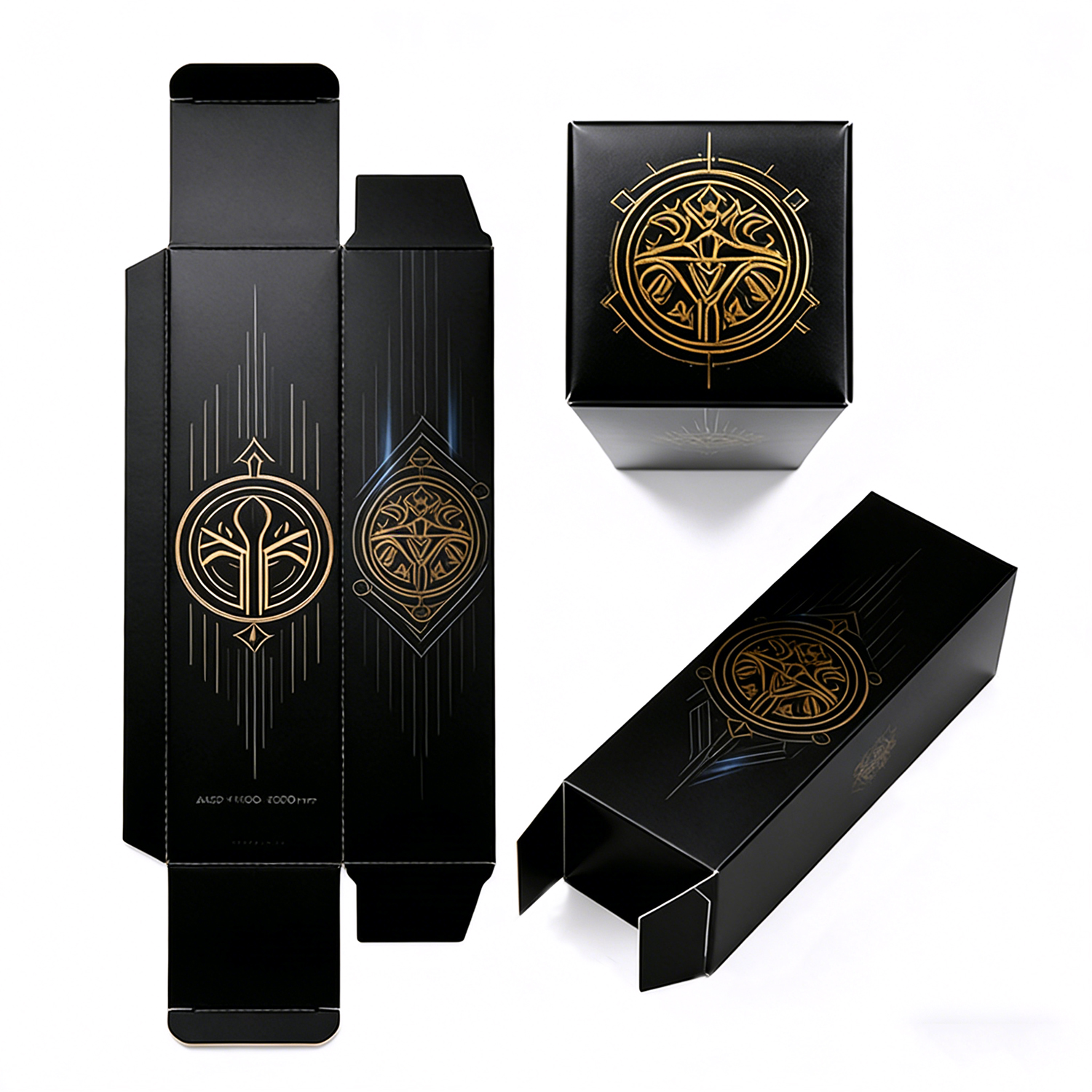 Deep matte black base for a modern, minimal look Metallic gold foil stamping for high-end visual impact Symmetrical geometric patterns inspired by sacred geometry Fine line detailing for a refined, artistic finish Centralized emblem-style design for strong brand identity