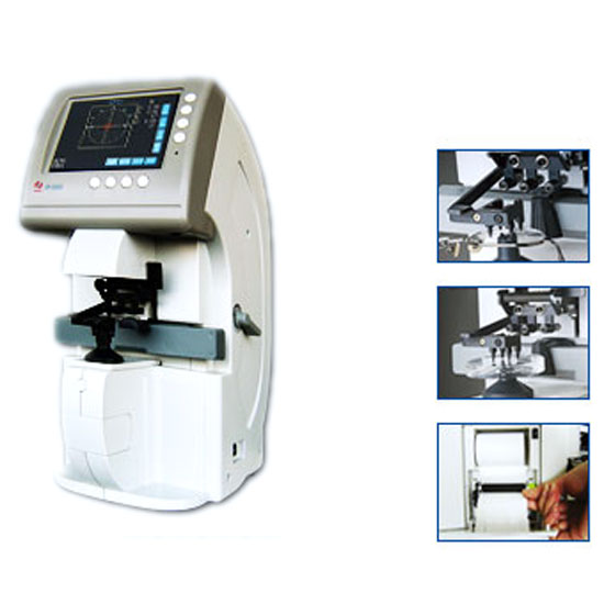 This automatic lens meter is designed to measure the optical properties of lenses. It comes with a graphical user interface for easy operation. The finely engineered lens meter can identify the lens type and automatically switch to measurement mode.