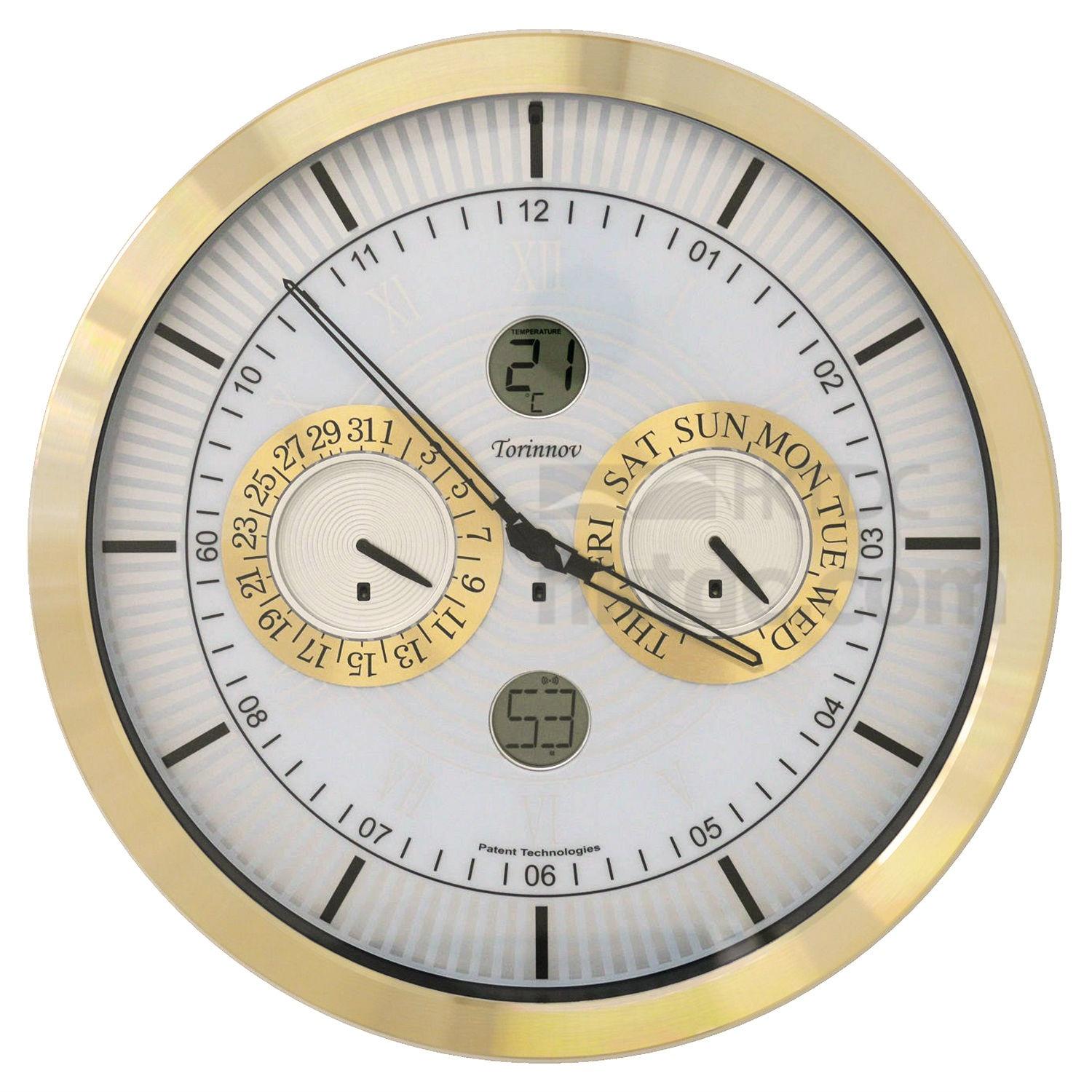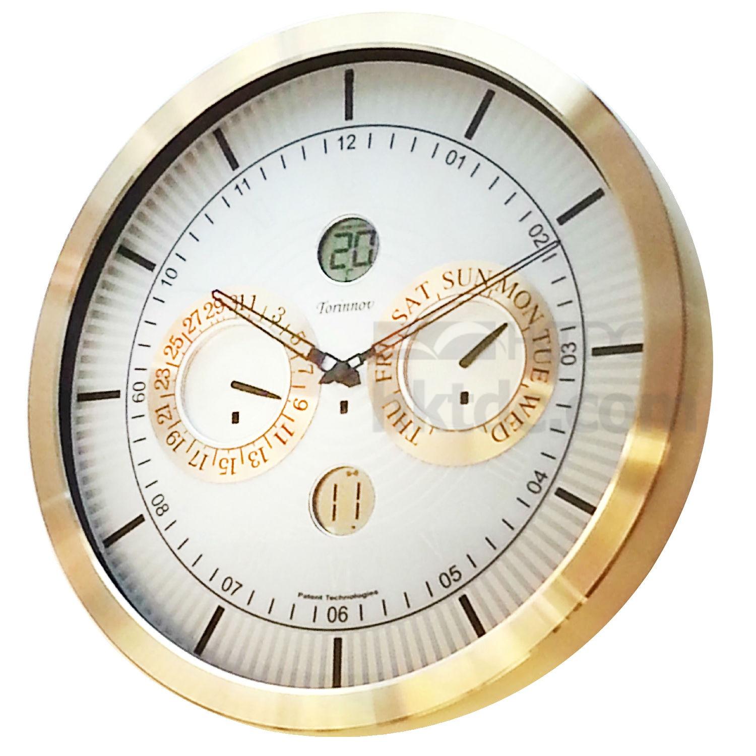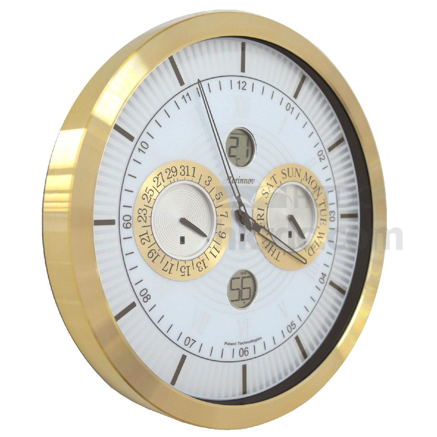 This wall clock runs on a multi-analogue and digital mechanism for added functionality. The transparent white dial, golden metal frame, two hands and two sub-dials. The automatic perpetual calendar completes this wall clock.