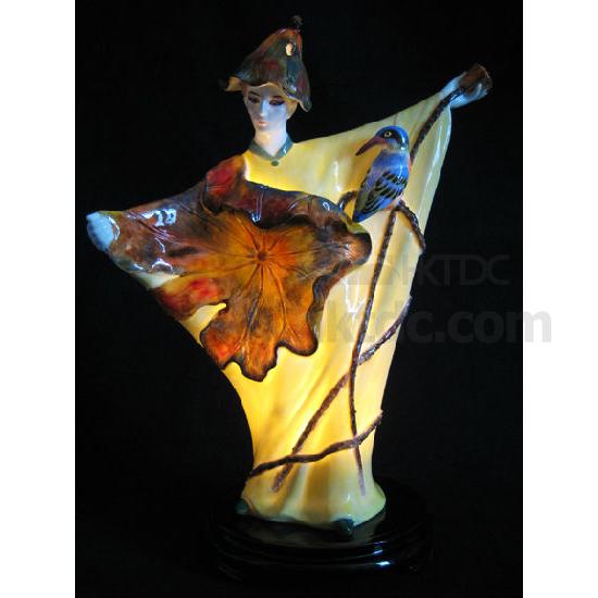 With the light on, a hidden opening beneath the lotus leaf lights up her face.