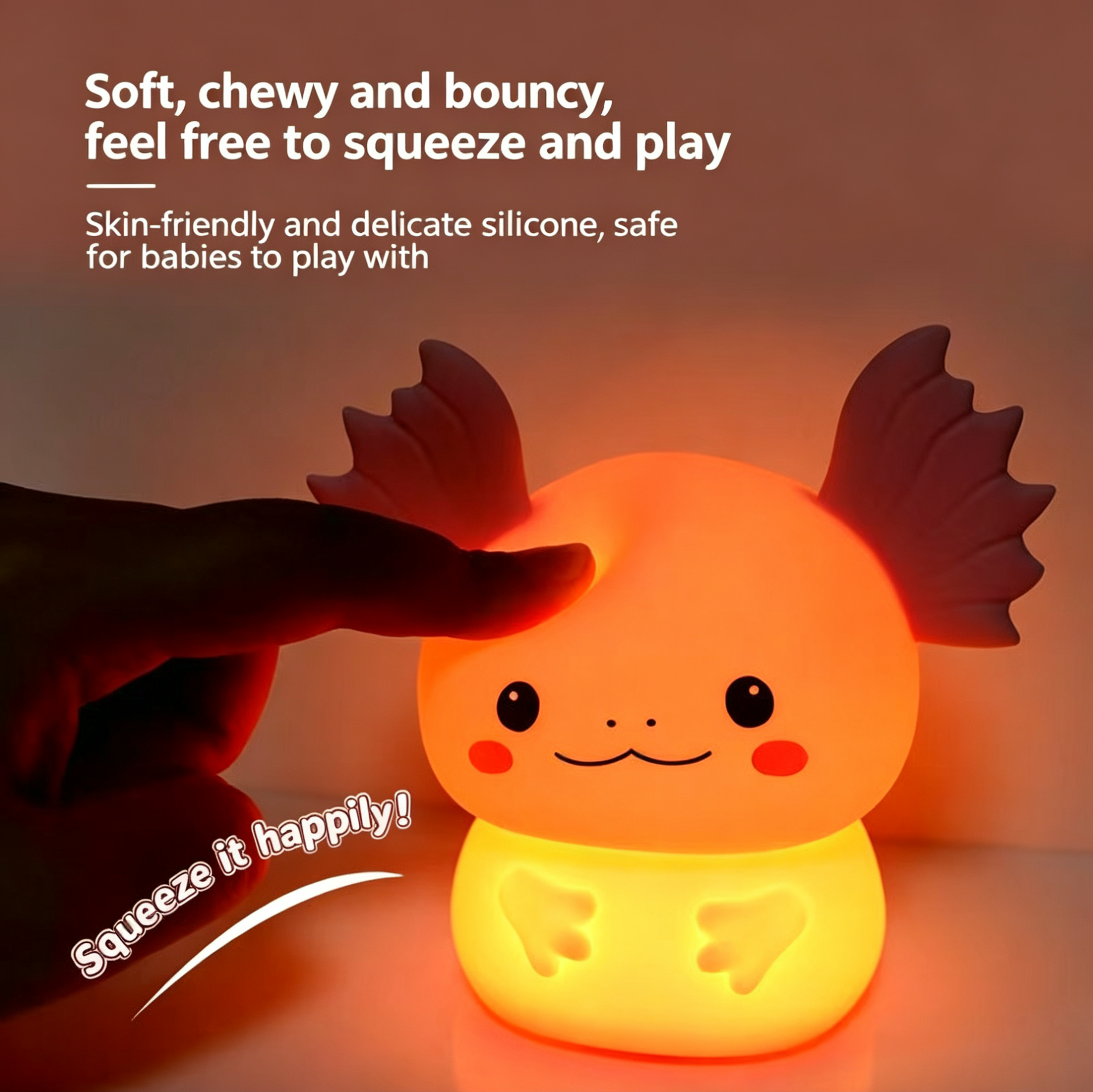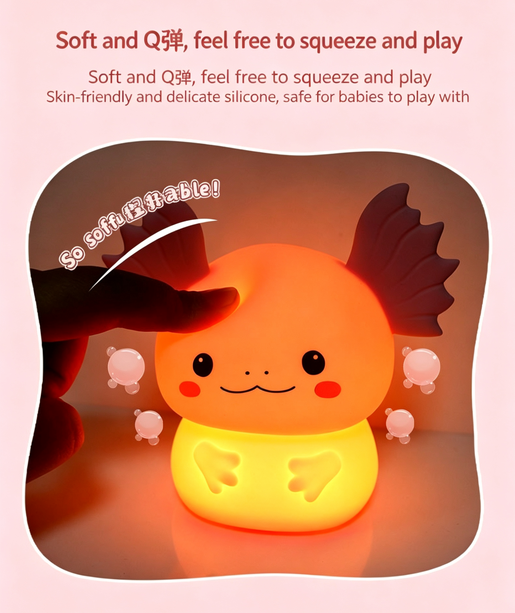 This adorable axolotl night light combines cute design with practical functions, making it a perfect companion for kids and adults alike. Made of high-quality soft silicone, it’s safe and comfortable to touch, and even fun to squeeze as a stress reliever.