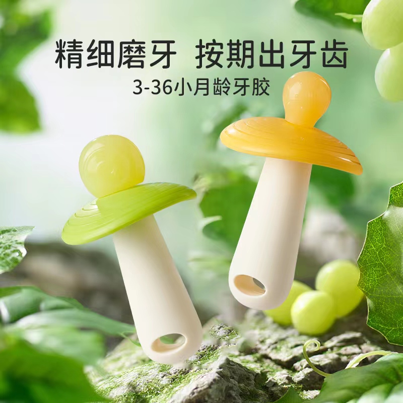 Food grade silicone material, soft, not easy to stick ash treatment, bite head with lollipop as the element, fresh and lively color on the color more childlike sense, the whole shape is rounded and full more secure, mushroom type block will not touch the face. Simple and full curved handle shape is easier for babies to grip.
