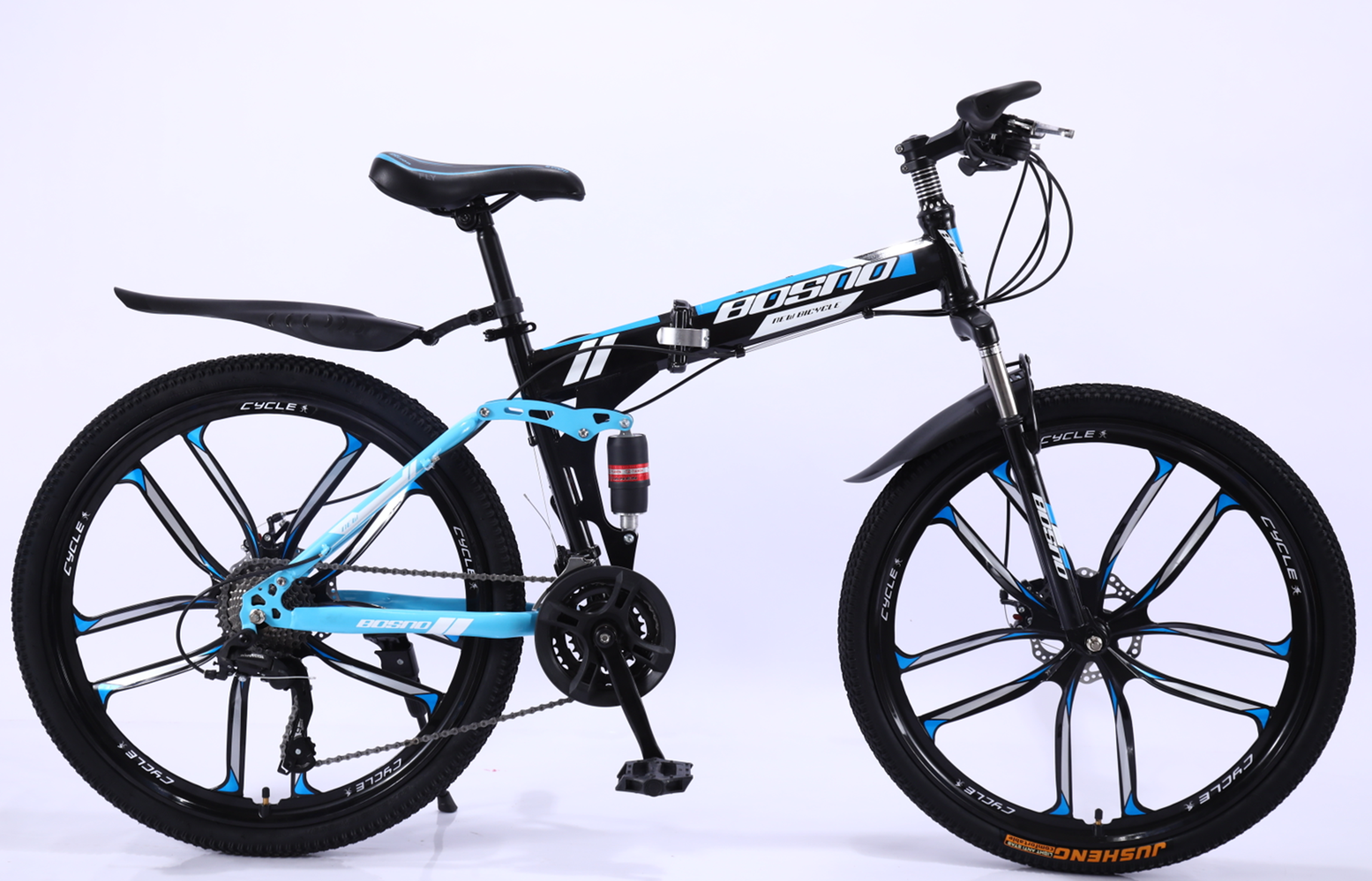 High carbon steel folding soft tail frame, sprayed inner sticker, double shock absorption, double disc brake, magnesium alloy integrated wheel, domestic transmission system (30 finger shift 50 rear derailleur), Hengqi/Huanyu/Jusheng 26×195 tires, natural rubber inner tube