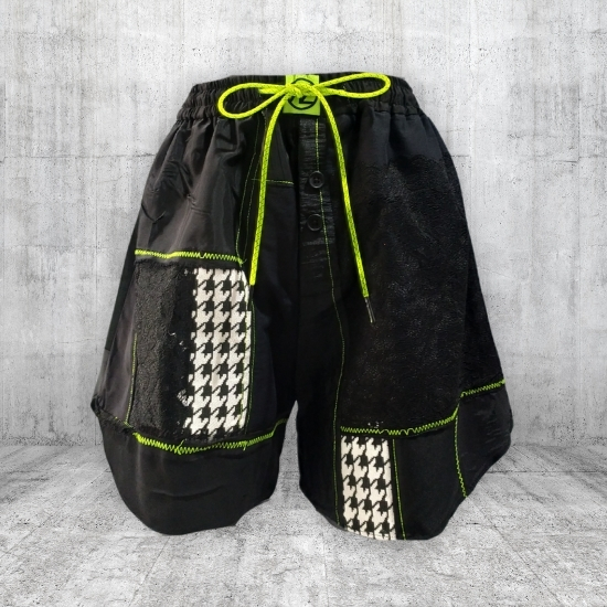 Black drawstring boxer made from various fabrics and textures