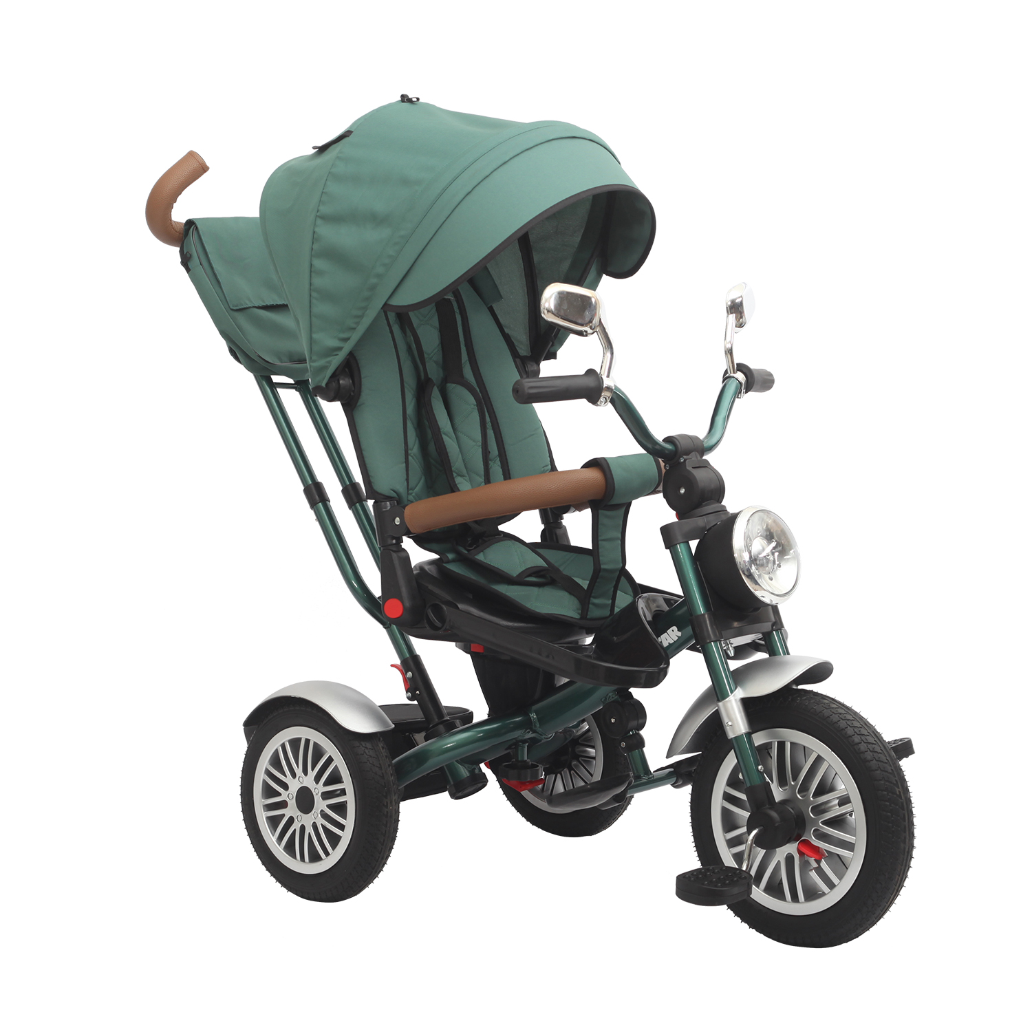 3.360°座椅旋转、三点式安全带、靠背半躺附皮质保护围栏、高档加大加宽遮阳蓬附加可拆卸蓬条、皮套烤漆双杆后推把可上下调节附加高档宾利妈咪挂包、车身附带加盖储蓄筐、