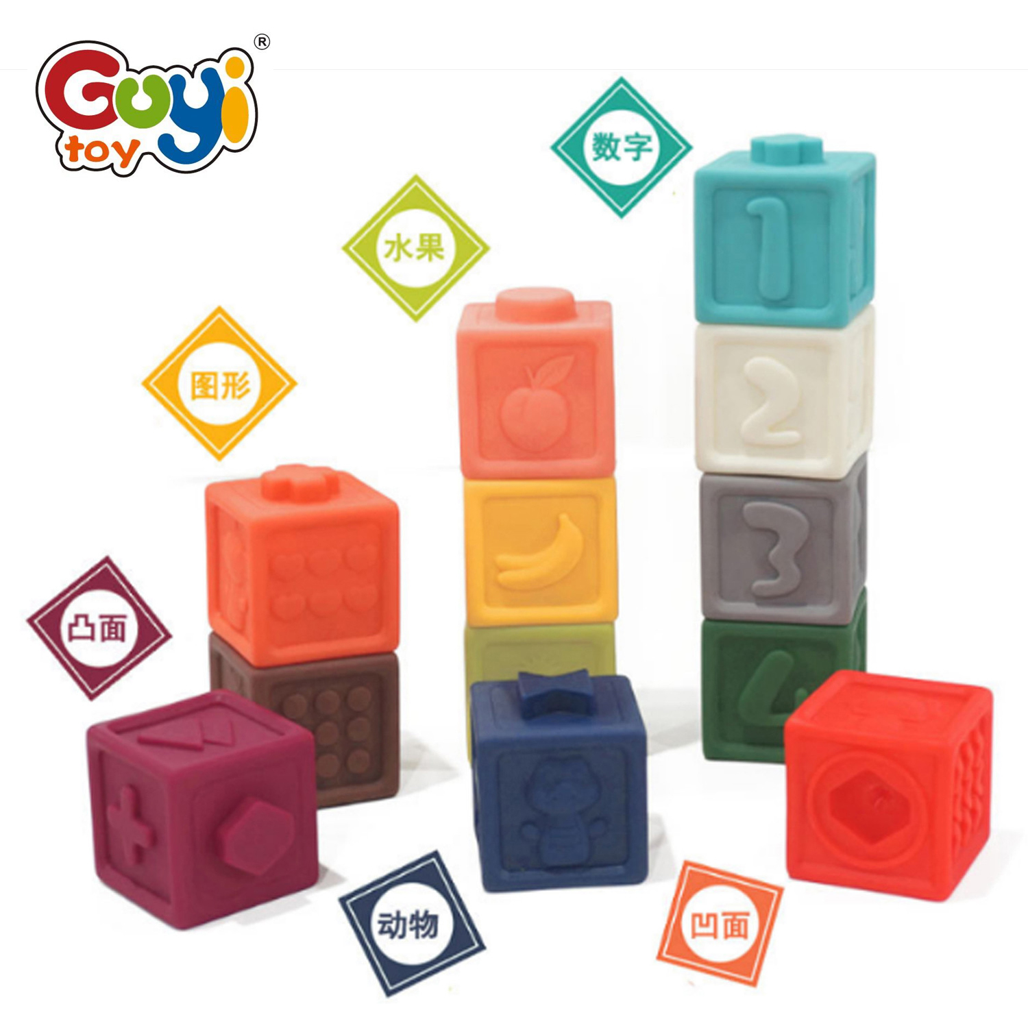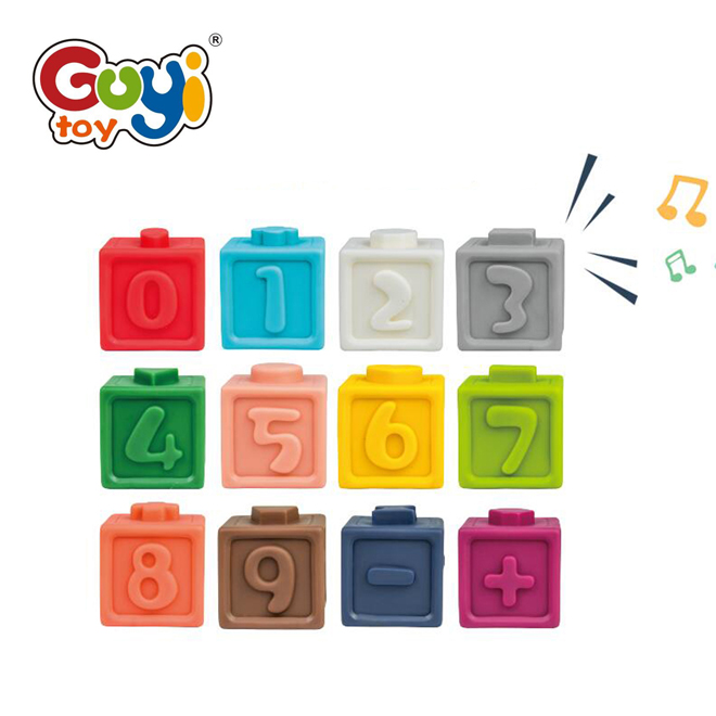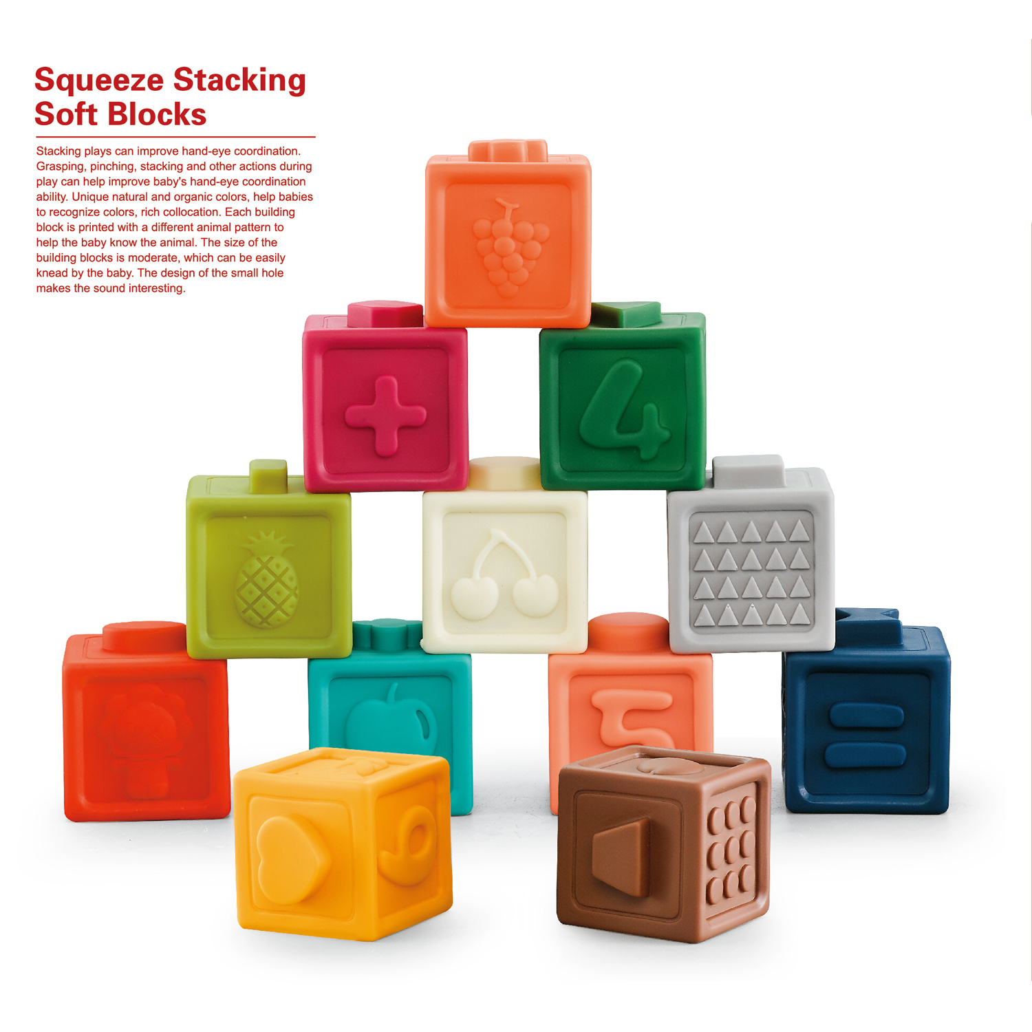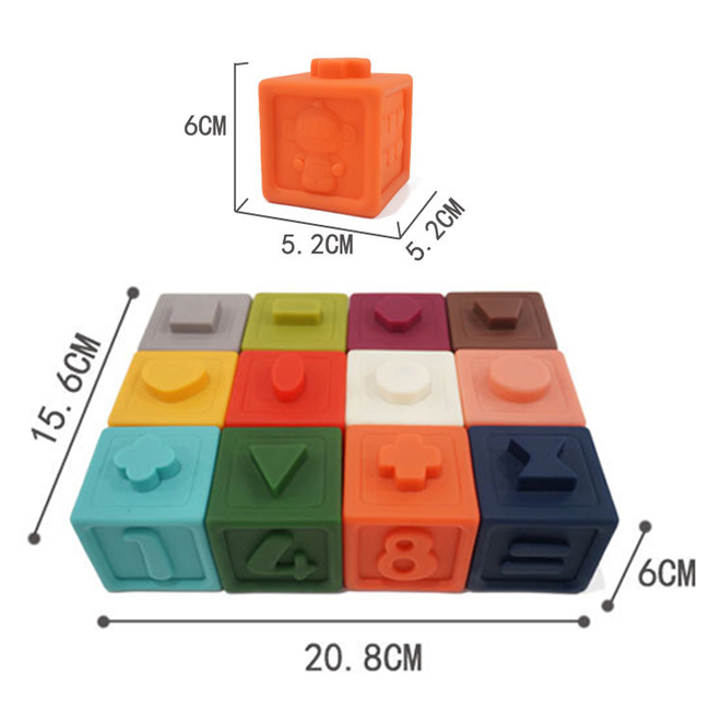 REMARK:Soft ,Eco-friendly material,easy to squeeze to make a squeaking sound,each block has different marks of six sides : animal, shape, fruit, Arabic numerals and geometric patterns.
