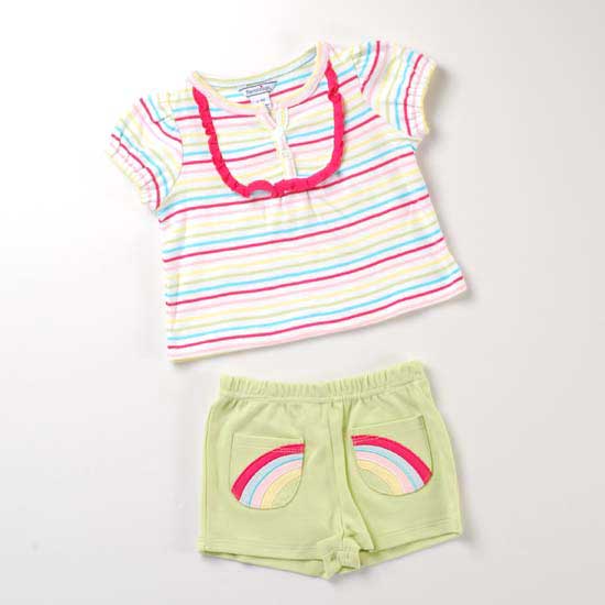 This photographed set of babies’ wear with a short-sleeve top and a pair of short pants. The pure cotton used ensures softness and comfort on the skin. The elastic waistline offers a flexible fit.