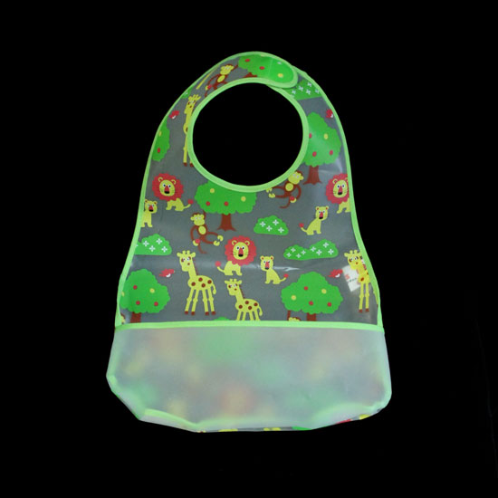 Featured is a baby bib made with non-toxic EVA. It is printed with zoo-themed graphics to delight young babies. The magic-tape closure ensures easy wearing and removing of the bib.