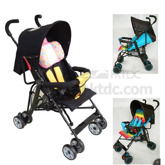3-positon recline backrest, rotatable & lockable front wheel, 5-point safety harness